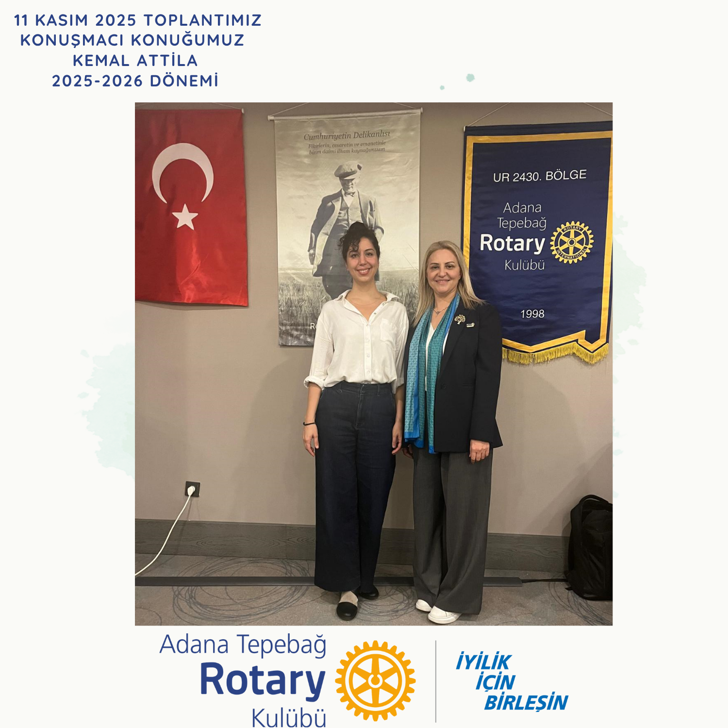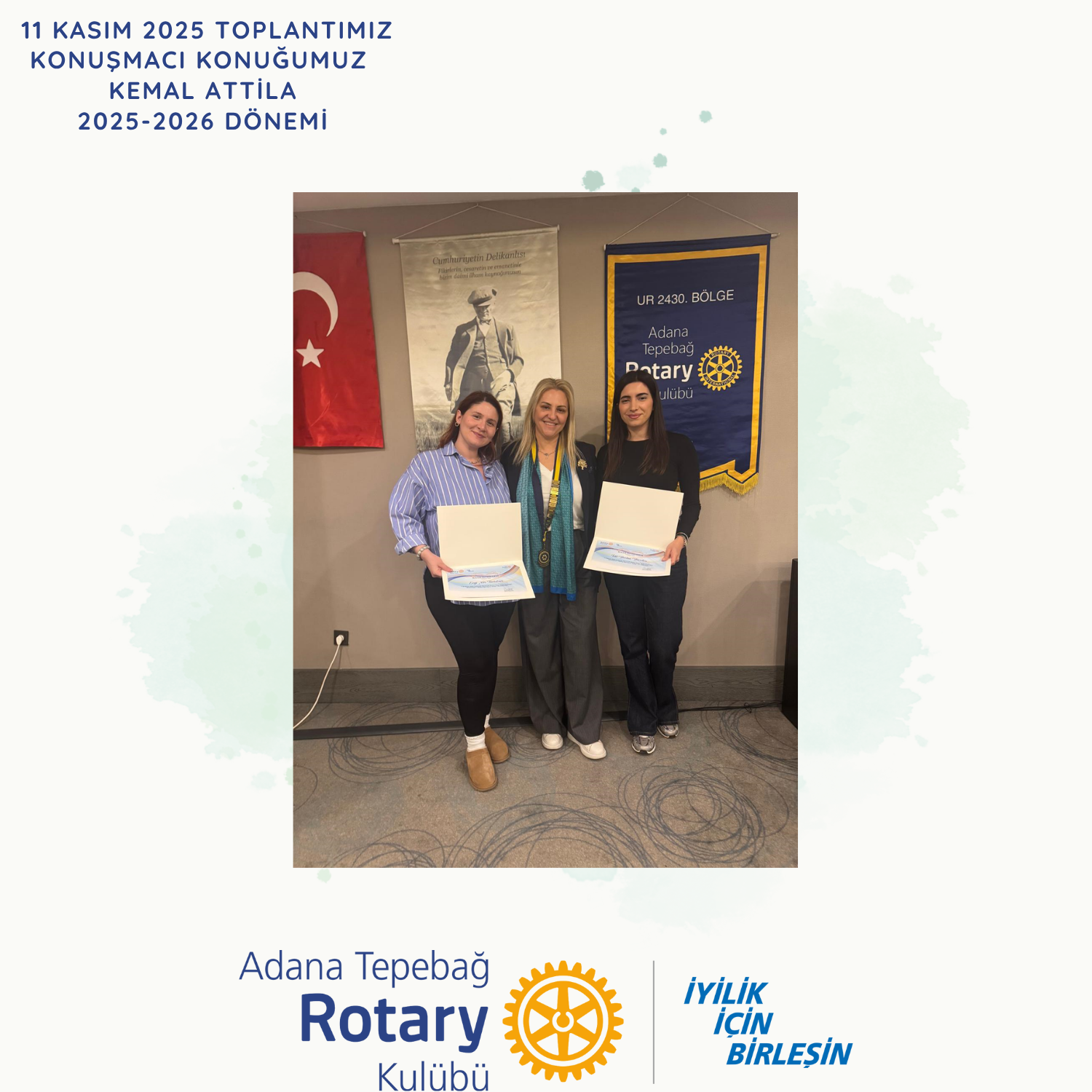 11 Kasım 2025 toplantımızda konuşmacı konuğumuz Gençlik Değişim Komite Başkanımız Kemal Attila "Rotary Nedir?" başlıklı sunusunu paylaştı. Rotary bilgilerimizi güncellediğimiz sunu için Kemal Attila'ya çooook teşekkür ediyoruz. Oda Müziği festivali organizasyon sorumlusu Gizem Kelleözü misafirimiz olarak organizasyon hakkında bilgi verdi. Tarsus Rotary Külübü başkanı Nur Gedik ve G.D.B. Figen Karail toplantımıza katılarak bizleri çooook mutlu ettiler. Haber Dosyaları: