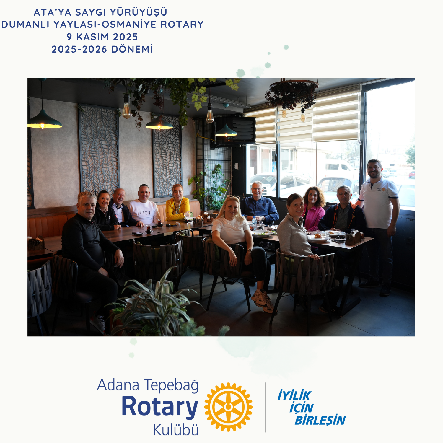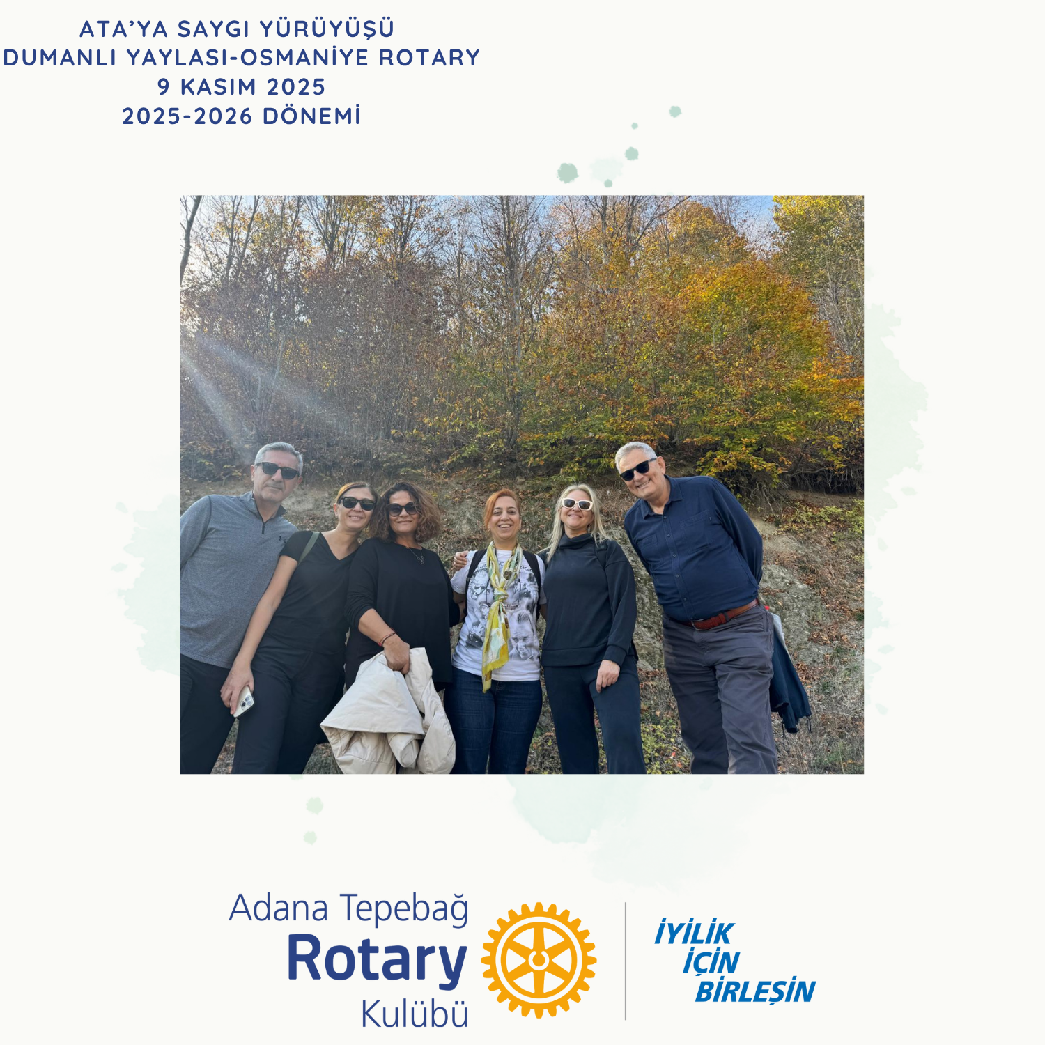 Dumanlı yaylasında 9 Kasım 2025 tarihinde ATA'YA Saygı yürüyüşüne Adana Tepebağ Rotary Kulübü olarak 6 kişi katıldık. ATA'YA Saygı yürüyüşünü organize eden Osmaniye Rotary ailesine çoook teşekkür ederiz. Haber Dosyaları: