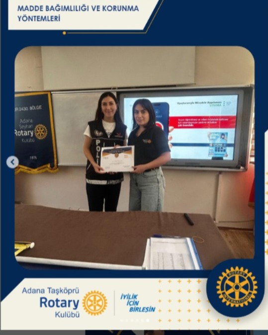 Adana Güney Rotary ve Antalya Falez Rotary Kulüpleri olarak, Defne Belediyesi ile işbirliği yaparak, Hatay Defne’de yaşayan ve depremden etkilenen vatandaşlarla bir araya gelerek yaşantılarını paylaştık. Bu projemizde psikolog dostlarımız katkı sağladılar. Depremden sonra artan madde kullanımına dikkat çekmek ve madde kullanımını önlemek için farkındalığı arttırmak amacıyla, Madde Bağımlılığı Ana Komite Başkanımız, Dr. Nida Terkuran “Madde Bağımlılığını Önlemek” konulu sunumu gerçekleştirdi.