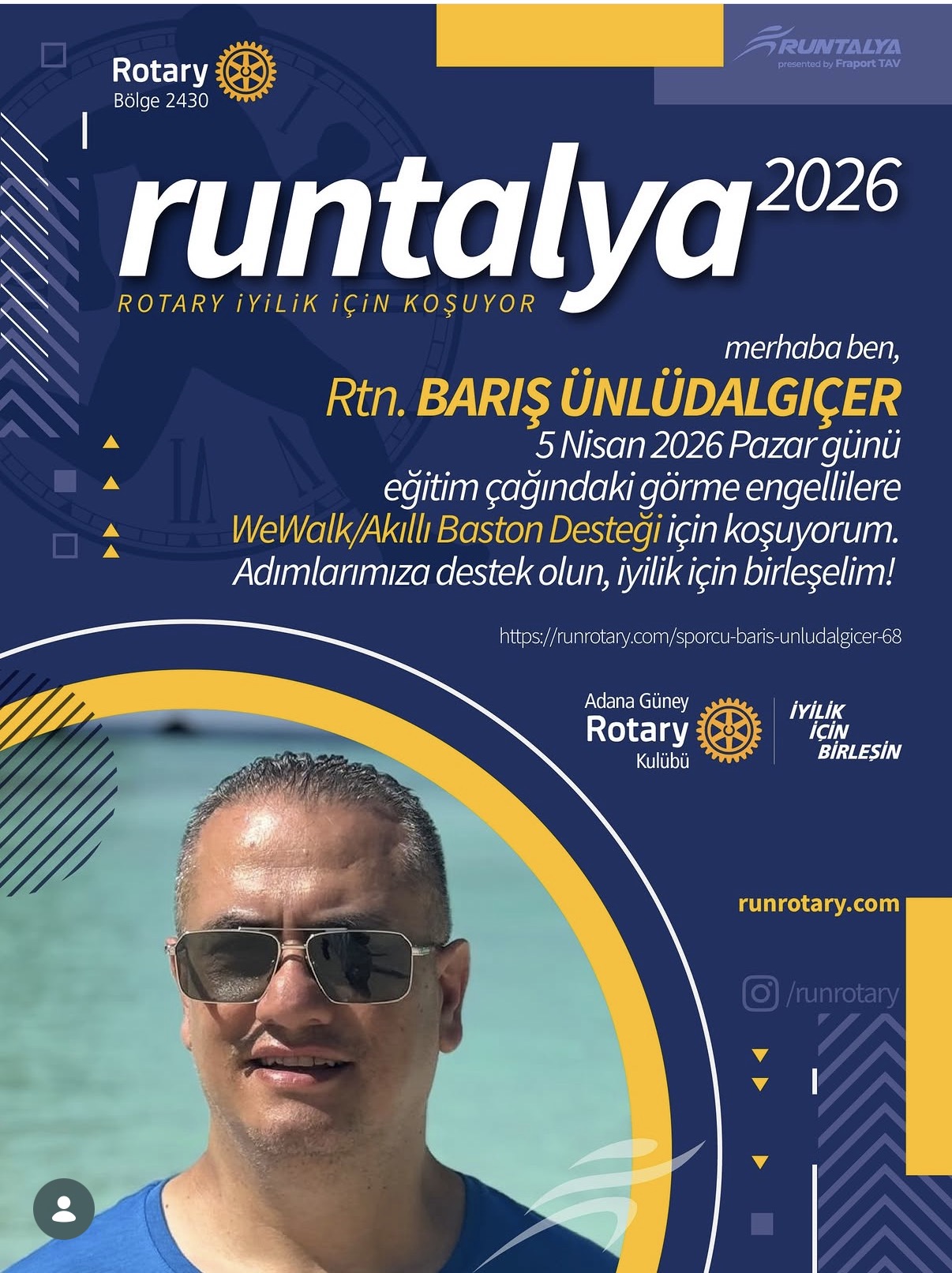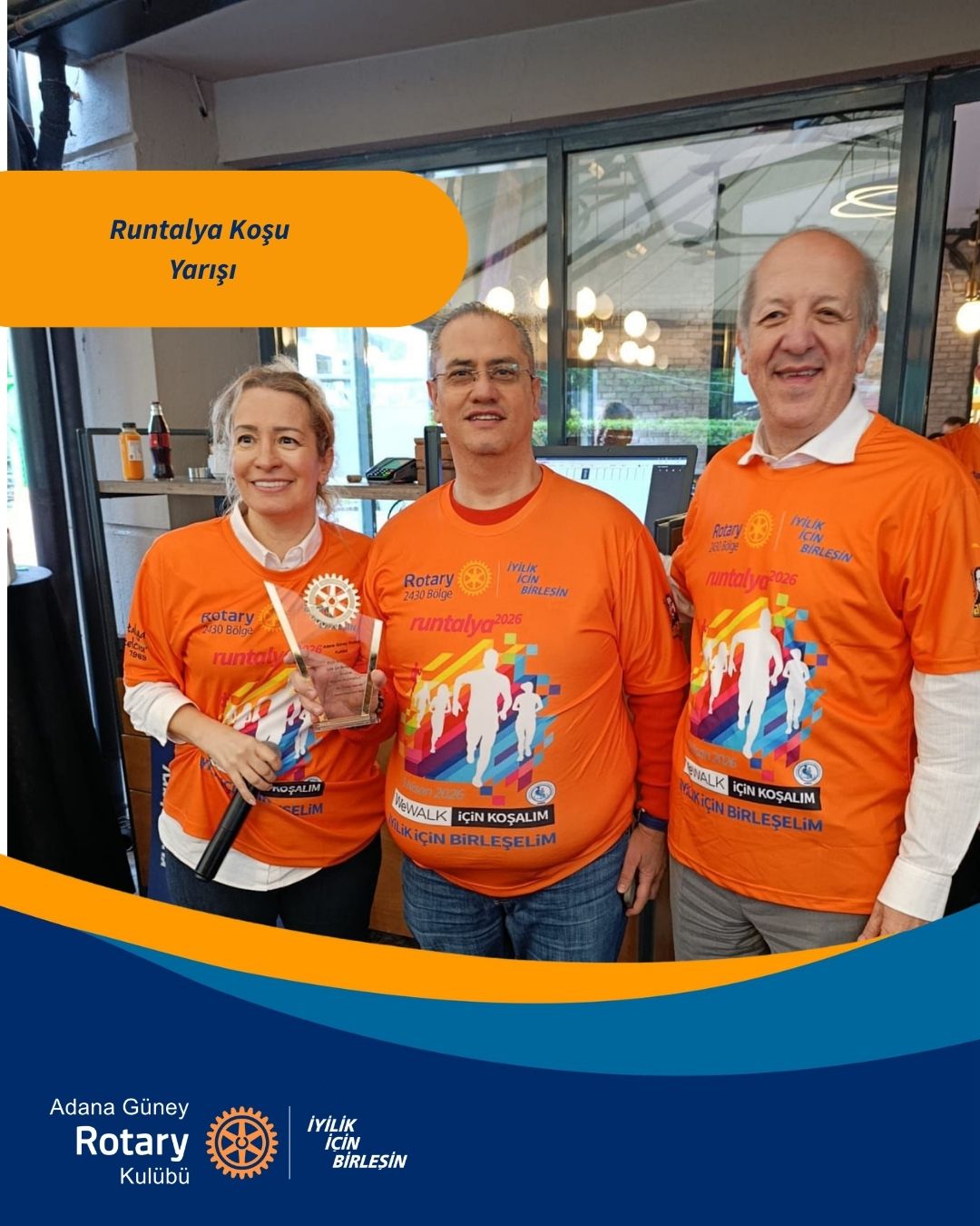 Adana Güney Rotary Kulübü olarak, üyemiz Barış Ünlüdalgıçer’in Runtalya koşusunda kulübümüzü başarıyla temsil etmesinden ve kulübümüze 3.lük ödülü kazandırmasından büyük gurur duyuyoruz.