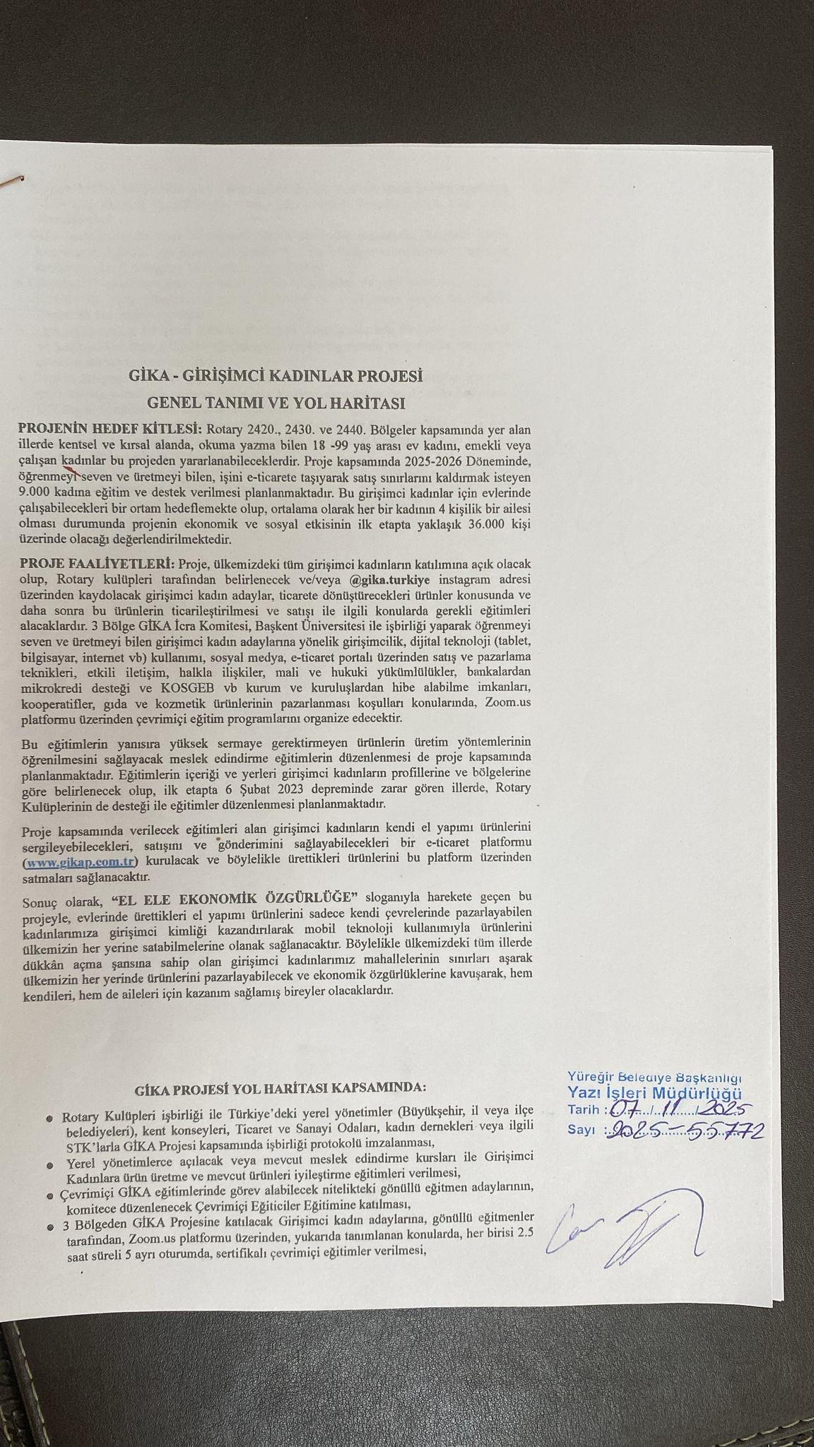 7 Kasım 2025 tarihinde, Mevlana Kültürevinde, Adana Seyhan, Güney ve Koza Rotary Kulüpleri olarak, Guvernörümüz Can Çığırgan ve eşi Suar ın katılımlarıyla Yüreğir Belediyesi Başkan Yardımcısı Cüneyt Patır ile GİKA Protokolü imzalanmıştır.