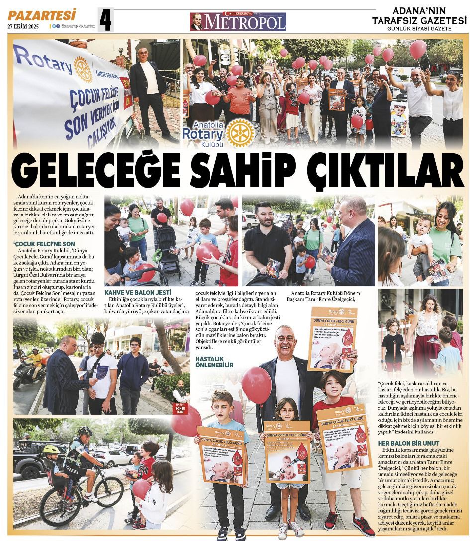 10 Pts GELECEĞE SAHİP ÇIKTILAR Kulüp Haberleri ANATOLİA ROTARY KLÜP ÜYELERİ 'DÜNYA ÇOCUK FELCİ GÜNÜ ' NEDENİ İLE SOKAĞA ÇIKTILAR Haber Dosyaları: Paylaş