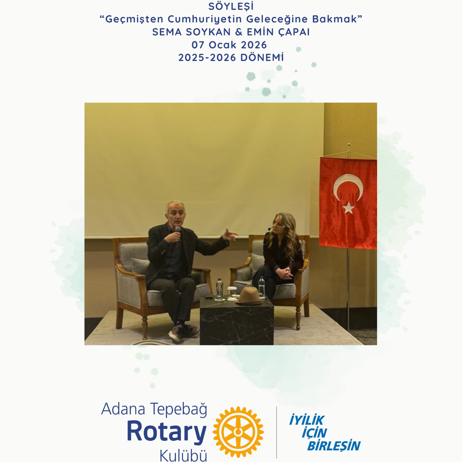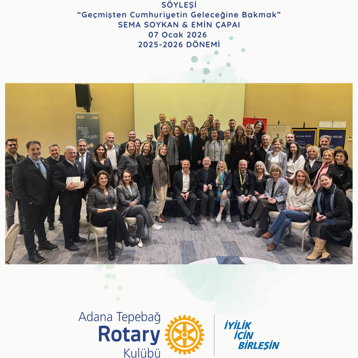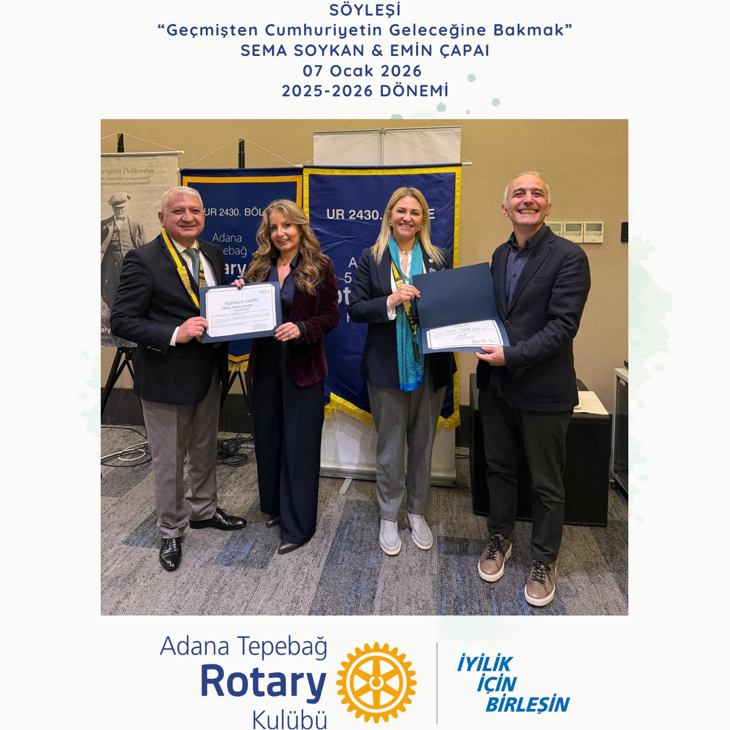Adana Tepebağ Rotary Kulübü ile Adana 5 Ocak Rotary Kulübü, Adana’nın düşman işgalinden kurtuluşunun 104. yıl dönümü haftasında, 7 Ocak 2026 tarihinde DoubleTree by Hilton Oteli’nde gerçekleştirilen ortak toplantıda, gazeteci ve ekonomi yorumcusu Emin Çapa ile araştırmacı-yazar Sema Soykan onur konuklarımız oldular.