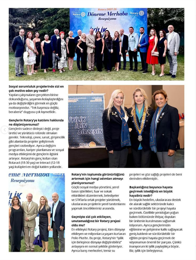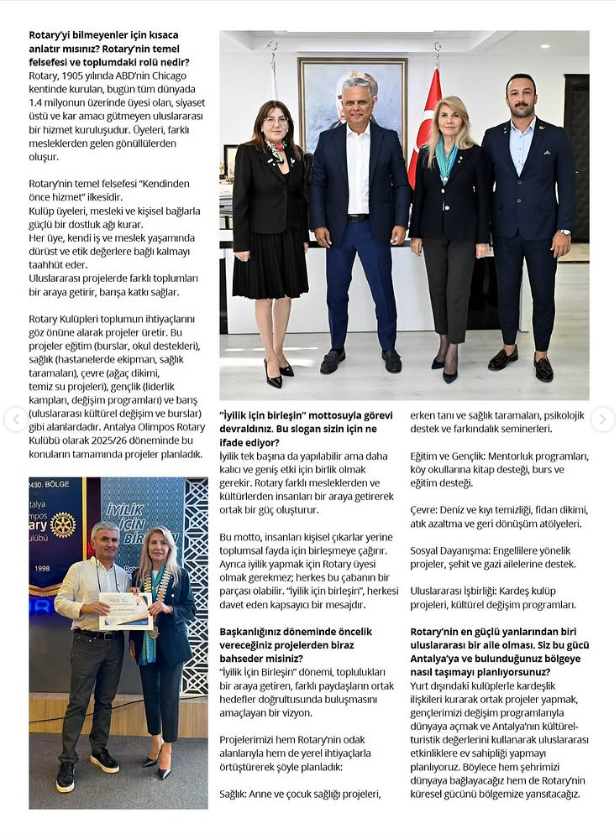 Antalya Olimpos Rotary 2025-26 Dönem Başkanı Tuba Subaşı, Antalyaface dergisinde kulübümüzün bu dönem hedeflerini paylaştığı bir röportaj gerçekleştirdi. Röportajda Rotary felsefesi ve rotaryenlerin toplum yararına yaptığı hizmetlere yer verilirken Olimpos Rotary Kulübünün devam eden projeleri hakkında bilgi paylaşımı yapıldı.