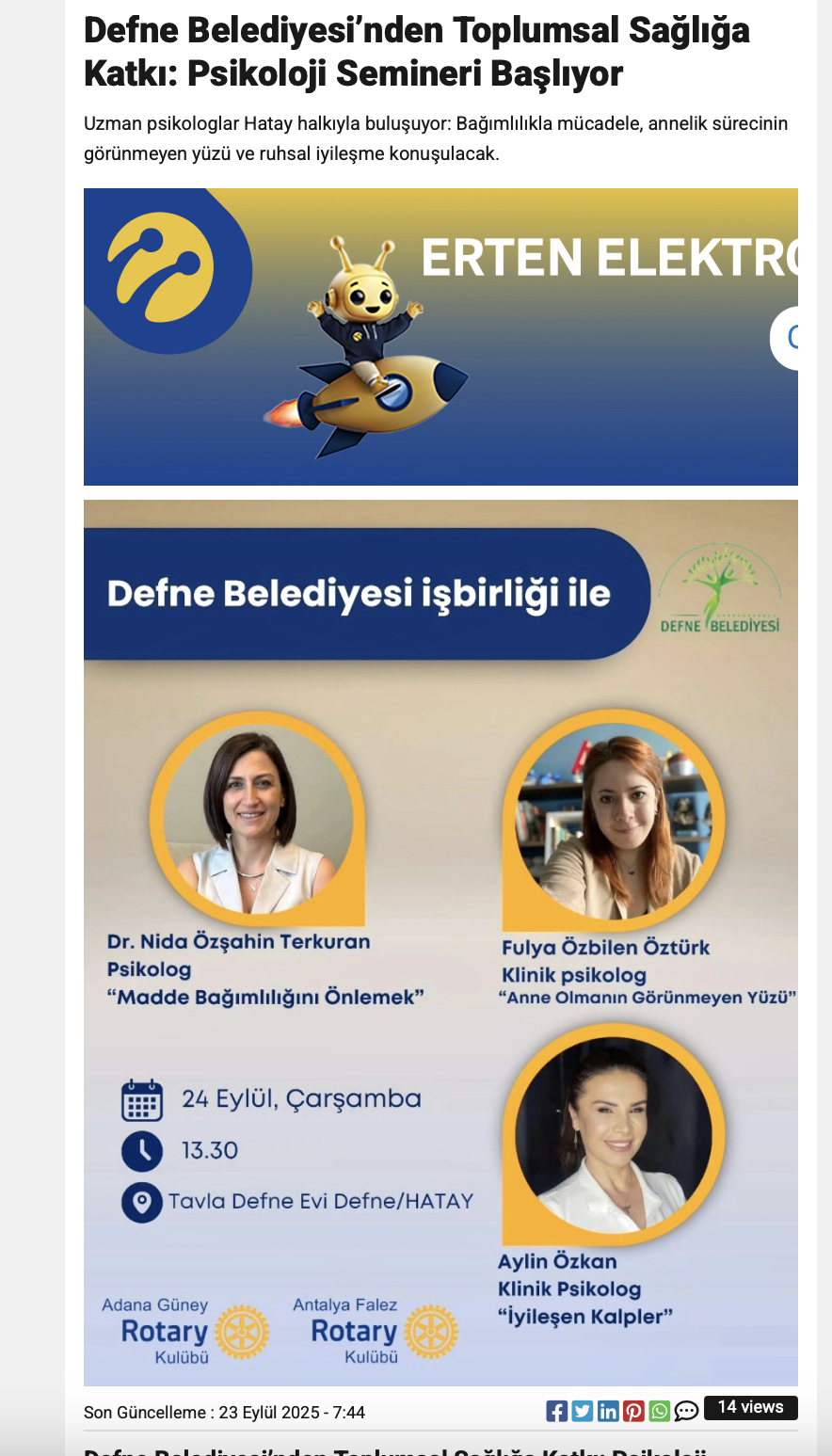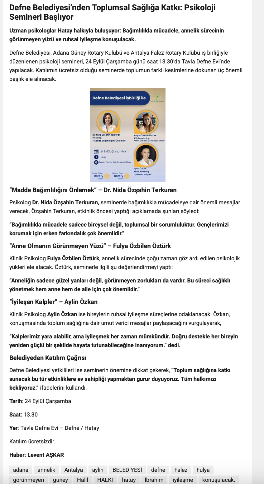 Ruh Sağlığı Ana Komite Başkanı Klinik Psikolog Aylin Özkan ise “İyileşen Kalpler” başlıklı konuşmasıyla deprem sonrası ruhsal ihtiyaçlar konusunda katılımcıları bilgilendirdi. Hatay Yeni haber gazete haberi de ekte sunulmuştur.