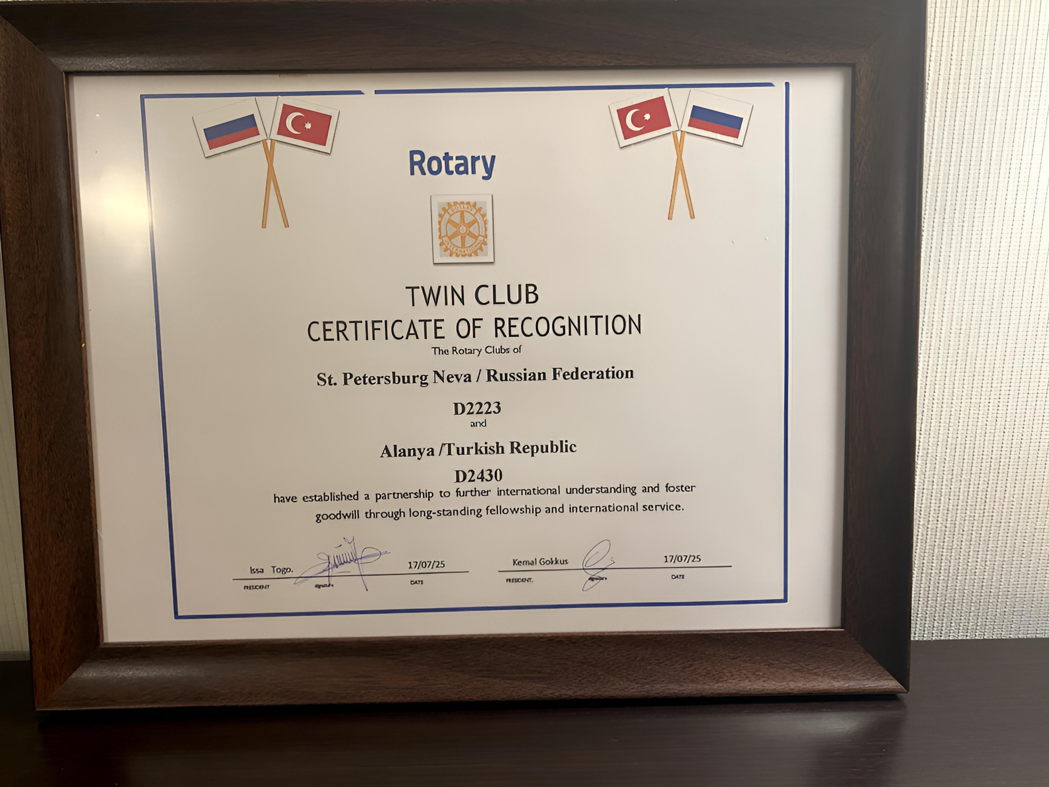Uluslararası Dostluk ve İş Birliği-Saint Petersburg-Neva Rotary Kulübü ile İkiz Kulüp Anlaşması imzalandı . ( 17-Temmuz -2025 )