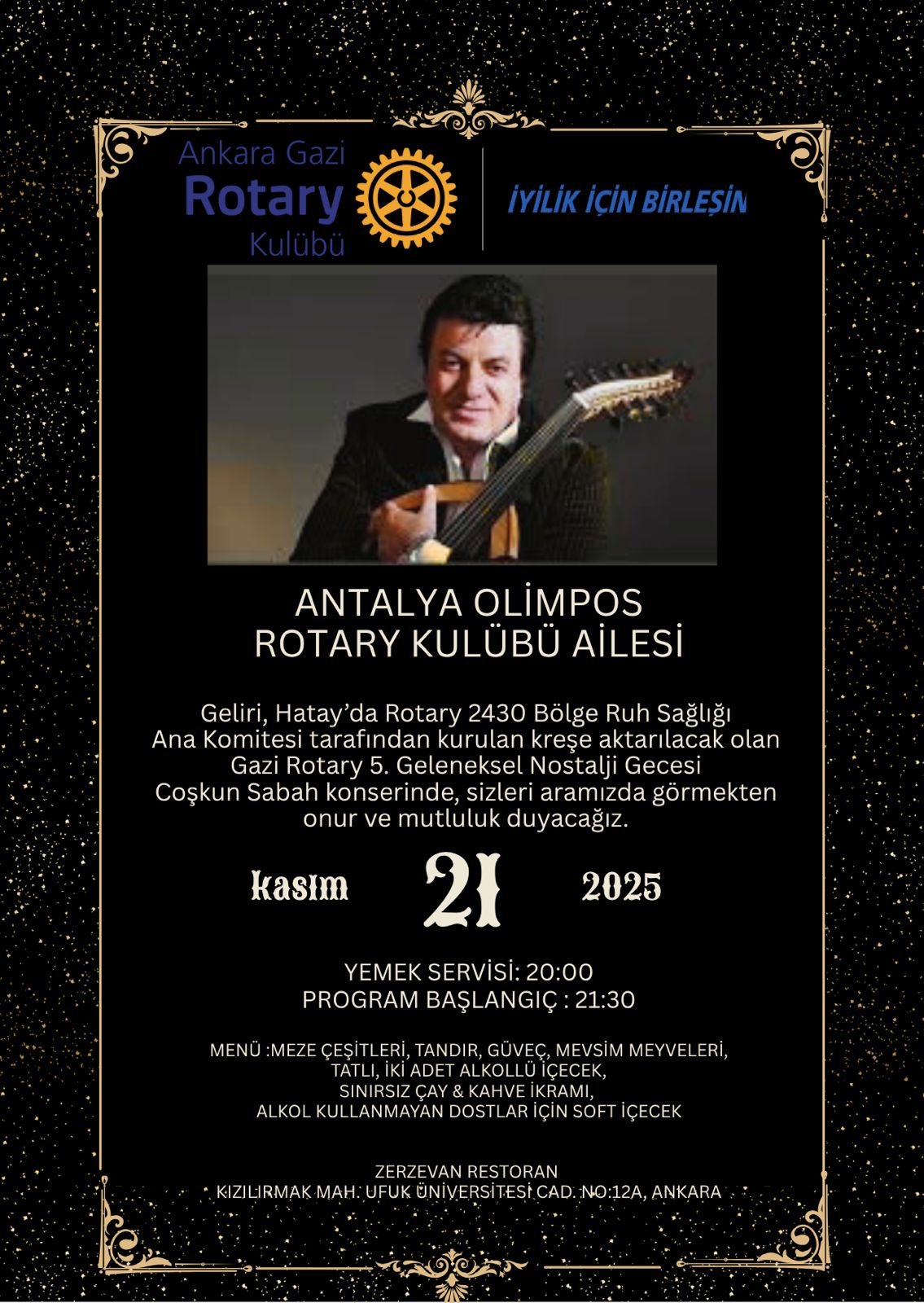 Geliri, Hatay’da Rotary 2430 Bölge Ruh Sağlığı Ana Komitesi tarafından kurulan kreşe aktarılacak olan Gazi Rotary Coşkun Sabah konserinden 5 bilet alarak destek olmuştur.