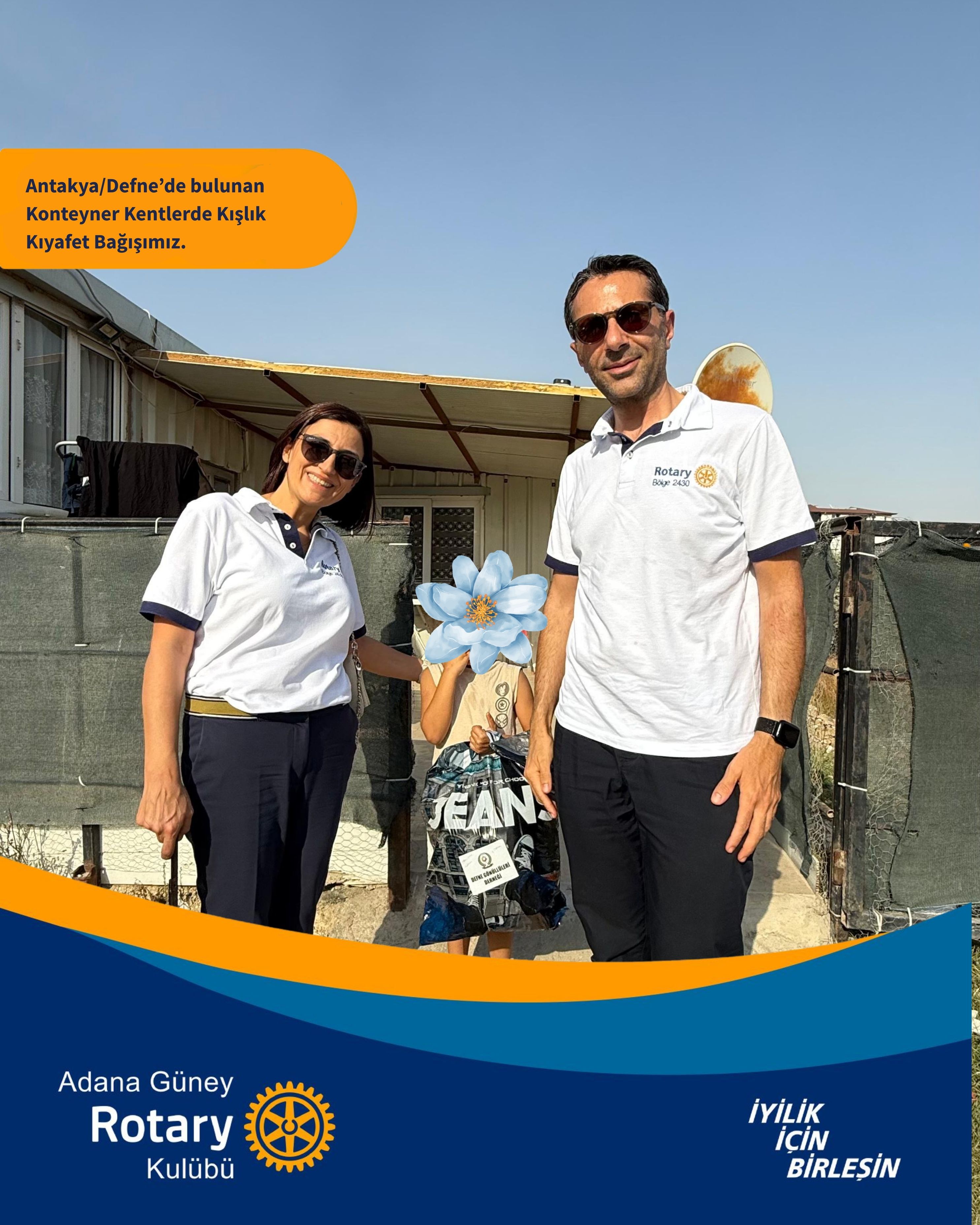 Adana Güney Rotary Kulübü olarak, Antakya/Defne ilçesinde, Defne Gönüllüleri Derneği işbirliği ile, konteyner kentlerde yaşamakta olan ailelerin çocuklarına kışlık bot, mont, kırtasiye, okul çantası yardımı yapılmıştır. Antakya deprem bölgesine , Yardımlarımız devam edecektir.