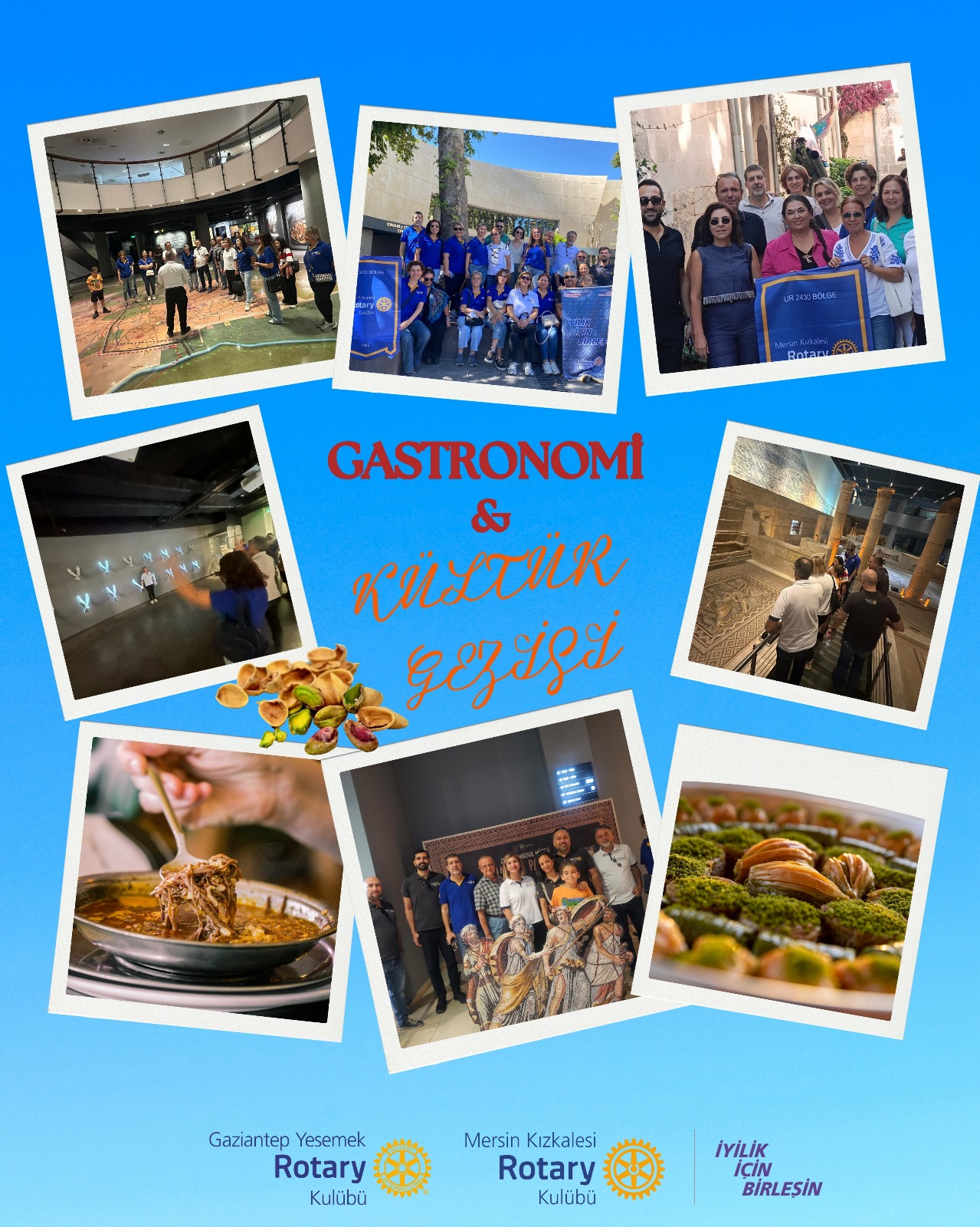 Mersin Kızkalesi Rotary Kulübü olarak Gaziantep Rotary Kulübü ile birlikte Gaziantep'e,27/28 eylül tarihinde Gastronomi gezisi düzenledik.Gaziantep'te yetişen ve çeşitli şekillerde taze mamül haline getirilen ürünlerden yapılan yemeklerin tanıma imkanı elde ettik.Kulüp üyelerimiz ,Beyran Çorbası,Yuvalama,Şiveydiz,Ali Nazik,Elşili ufak köfte,altı ezmeli kebap ve baklava çeşitleri gibi bir çoğu coğrafi işaret almış yemeklerin tadını deneyimledi.