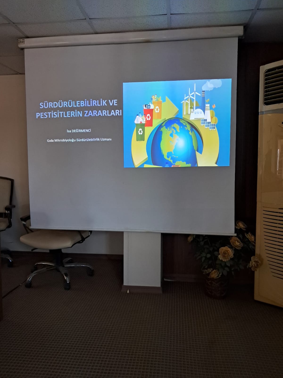 TARSUS ZİRAAT ODASINDA, PESTİSİTLER VE TARIMSAL SÜRDÜRÜLEBİLİRLİK KONUSUNDA ORTAK BİR PROJE İLE EĞİTİM SEMİNERİ VERİLDİ. EĞİTİM SEMİNERİNDE GIDA GÜVENLİĞİ, GIDA GÜVENCESİ, PESTİSİTLER VE DOĞRU KULLANIMI, TARIMSAL SÜRDÜRÜLEBİLİRLİK KONULARINDA SEMİNER VERİLDİ. ZİRAAT ODASI PERSONELİNİN HEM DİNLEYİCİ OLDUĞU HEM DE KATKI SAĞLADIĞI BİR PROJE OLDU. ÇİFTÇİLERE TOPLANTI BİLGİLENDİRMESİ VE TOPLANTININ ORGANİZASYONU TARSUS ZİRAAT ODASI TARAFINDAN SAĞLANDI.