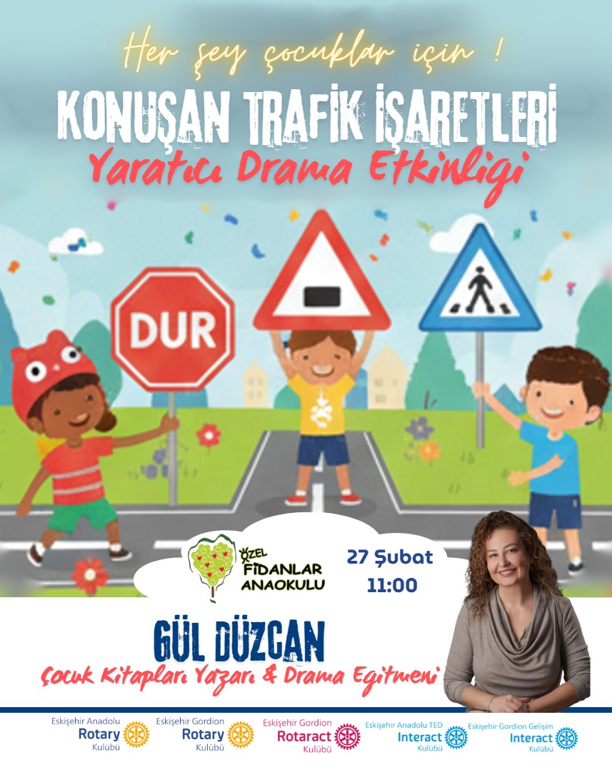 KONUŞAN TRAFİK İŞARETLERİ İLE MINiKLER TRAFİĞi ÖĞRENDİ Esikşehir Gordion RK olarak Eskişehir'de çocuklara yönelik farkındalık çalışmalarımız hız kesmeden devam ediyor. "Her şey çocuklar için" anlayışıyla hayata geçirilen Konuşan Trafik İşaretleri - Yaratıcı Drama Etkinliği, miniklere trafik kurallarını eğlenerek öğretmeyi amaçladı. Özel Fidanlar Anaokulu'nda gerçekleştirilen etkinlikte, Çocuk Kitapları Yazarı ve Drama Eğitmeni Gül Düzcan, yaratıcı drama yöntemiyle trafik işaretlerini adeta "konuşturdu". Çocuklar; dur levhası, yaya geçidi ve uyarı levhalarını canlandırarak hem sahneye çıktılar hem de günlük hayatta karşılaşabilecekleri trafik durumlarını deneyimlediler. Etkinlik boyunca minikler; trafikte dikkat, kurallara uyma, karşıdan karşıya güvenli geçiş ve sorumluluk bilinci gibi temel kavramları oyun yoluyla öğrenme fırsatı buldu. Eğlenerek öğrenmenin gücüyle desteklenen çalışma, çocukların hem özgüvenlerini geliştirdi hem de trafik bilincinin küçük yaşta kazandırılmasına katkı sağladı.