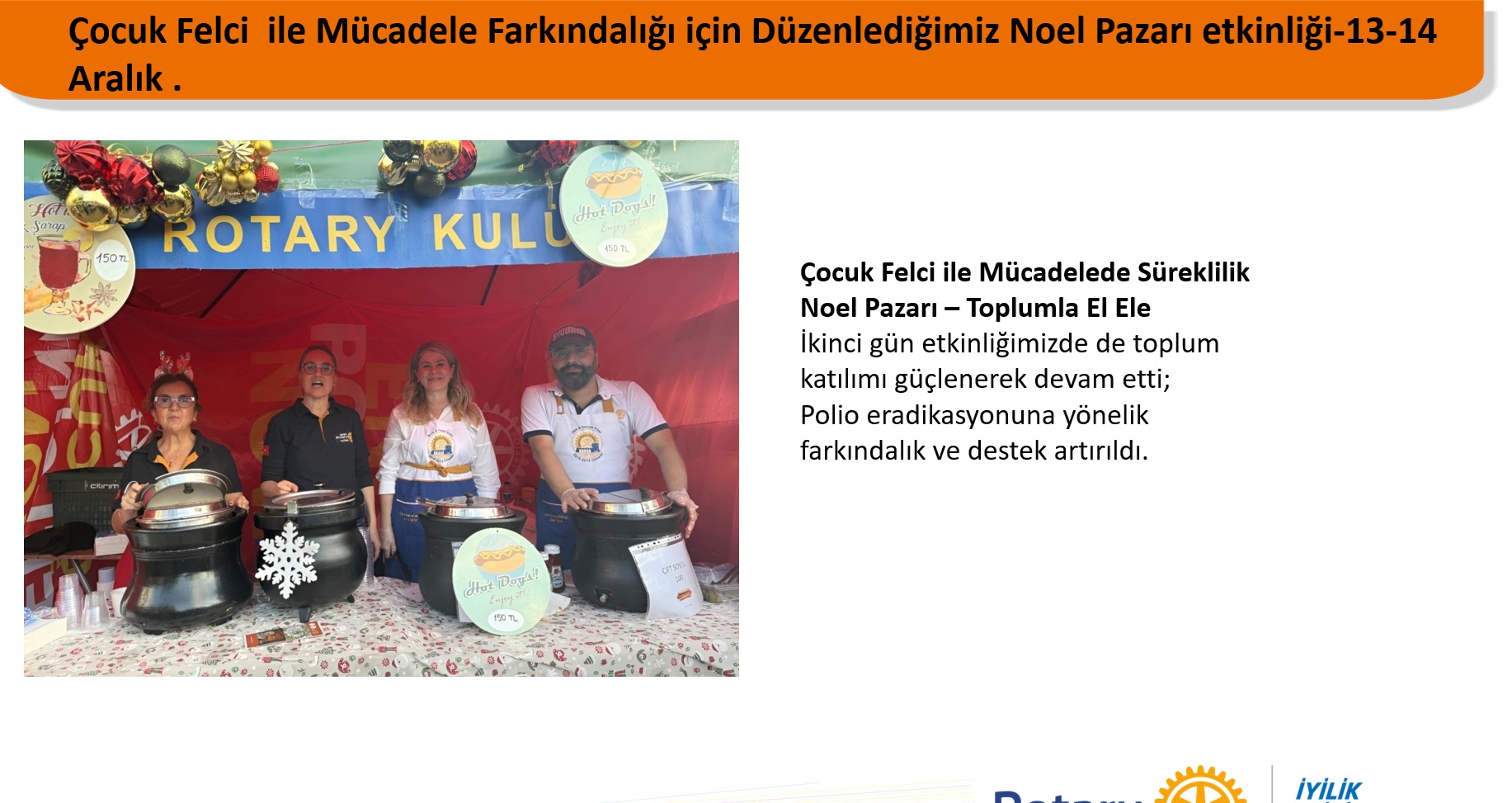 Noel Pazarı etkinliğimiz ile Polio mücadelesine dikkat çekerek hem toplumsal farkındalık oluşturduk hem de Polio eradikasyon çalışmalarına kaynak sağladık.Bu proje Alanya'da da çok önemli bir halk kesimi tarafından rağbet gördü. 257.000 TL'lik polio ile mücadelede kullanılmak üzere gelir sağlandı.