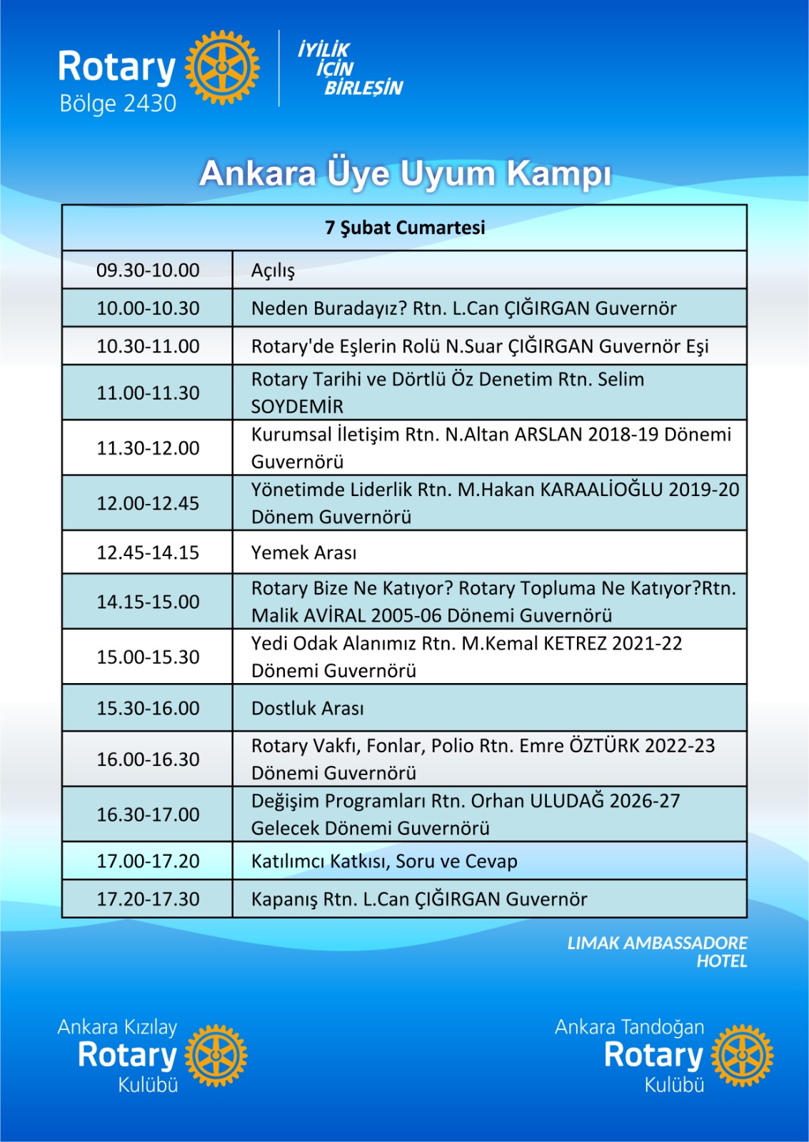 7 ŞUBAT 2026 TARİHİNDE LİMAK AMBASSADOR OTELDE ANKARA KIZILAY ROTARY KULÜBÜ İLE BİRLİKTE 122 KATILIMCININ OLDUĞU ÜYE UYUM KAMPI DÜZENLENDİ. GÜN BOYU ROTARY KONUSUNDA EĞİTİMLER VERİLDİ. AKŞAMINA DA BİR KÜÇÜK GURUP YEMEĞE GİDİLDİ.