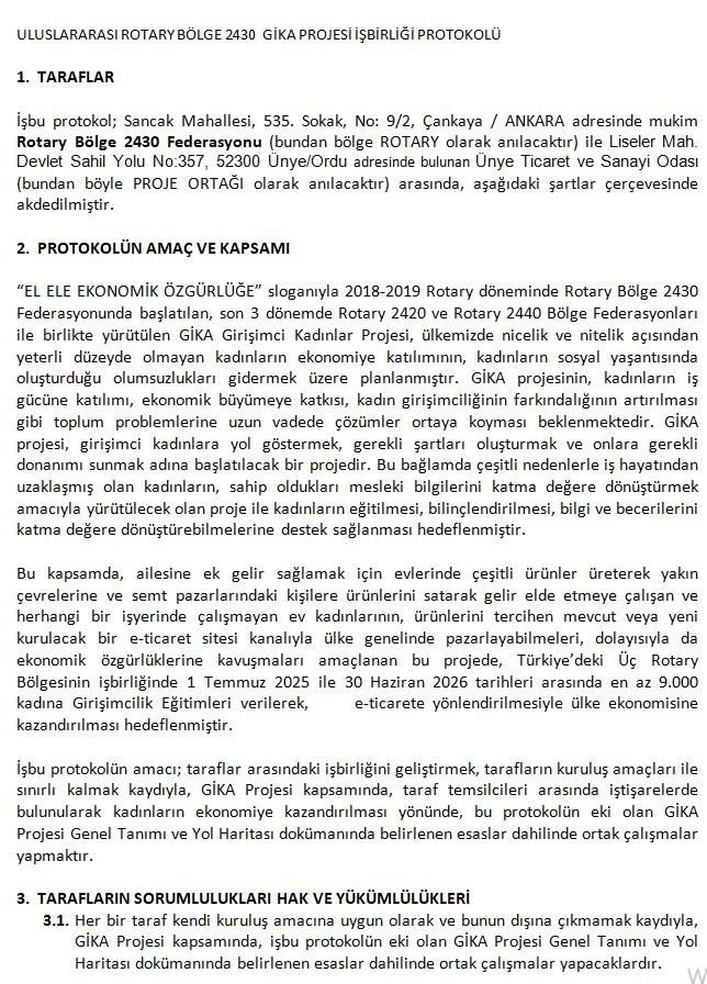 Ünye Ticaret Odası ile yapılan görüşmeler sonrasında ilgili protokolün imzalanması konusunda fikir ve işbirliğine varılmış olup 10.04.2026 tarihinde protokol imzalanacak ve ilgili evraklar Rotary 2430. Bölge'ye gönderilerek süreç tamamlanacaktır (10.04.2026 tarihinde yapılacaktır)