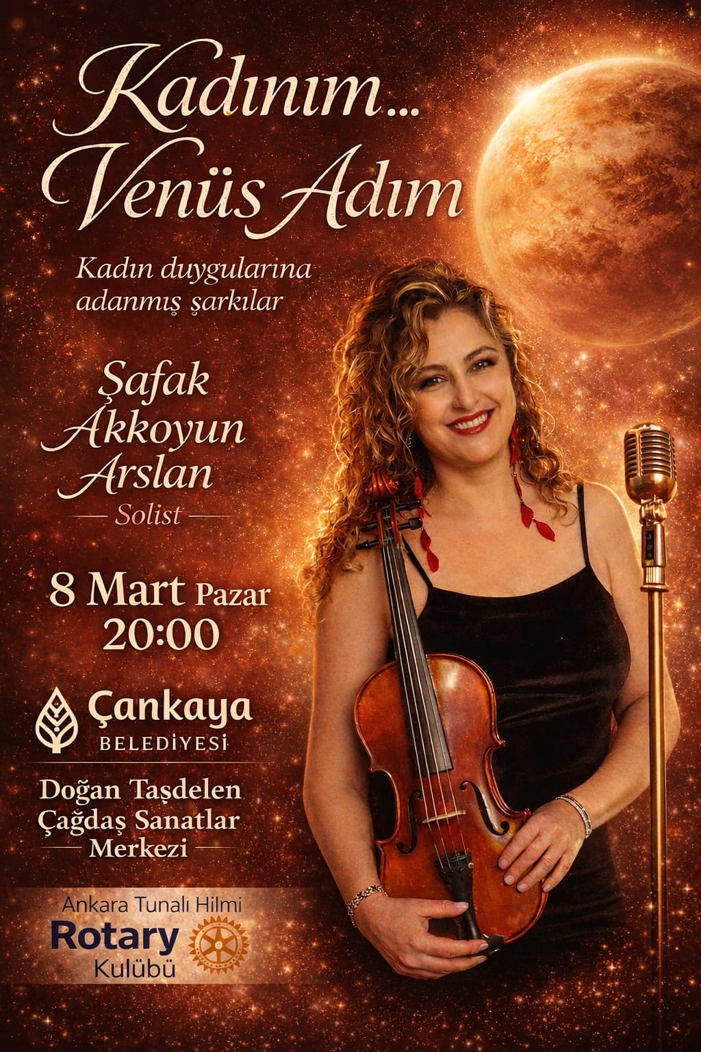 Şafak Akkoyun Arslan, kadın duygularına adanmış şarkılar ve kendi besteleriyle dinleyicileri etkileyici bir müzik yolculuğuna davet ediyor. Ankara Tunalı Hilmi Rotary Kulübü ise müziğin birleştirici gücüyle bu anlamlı gecede dayanışmayı büyütüyor. Bu özel geceden elde edilecek gelir, Mamak’ta bir ilkokula kurulacak kütüphane için kullanılacaktır.