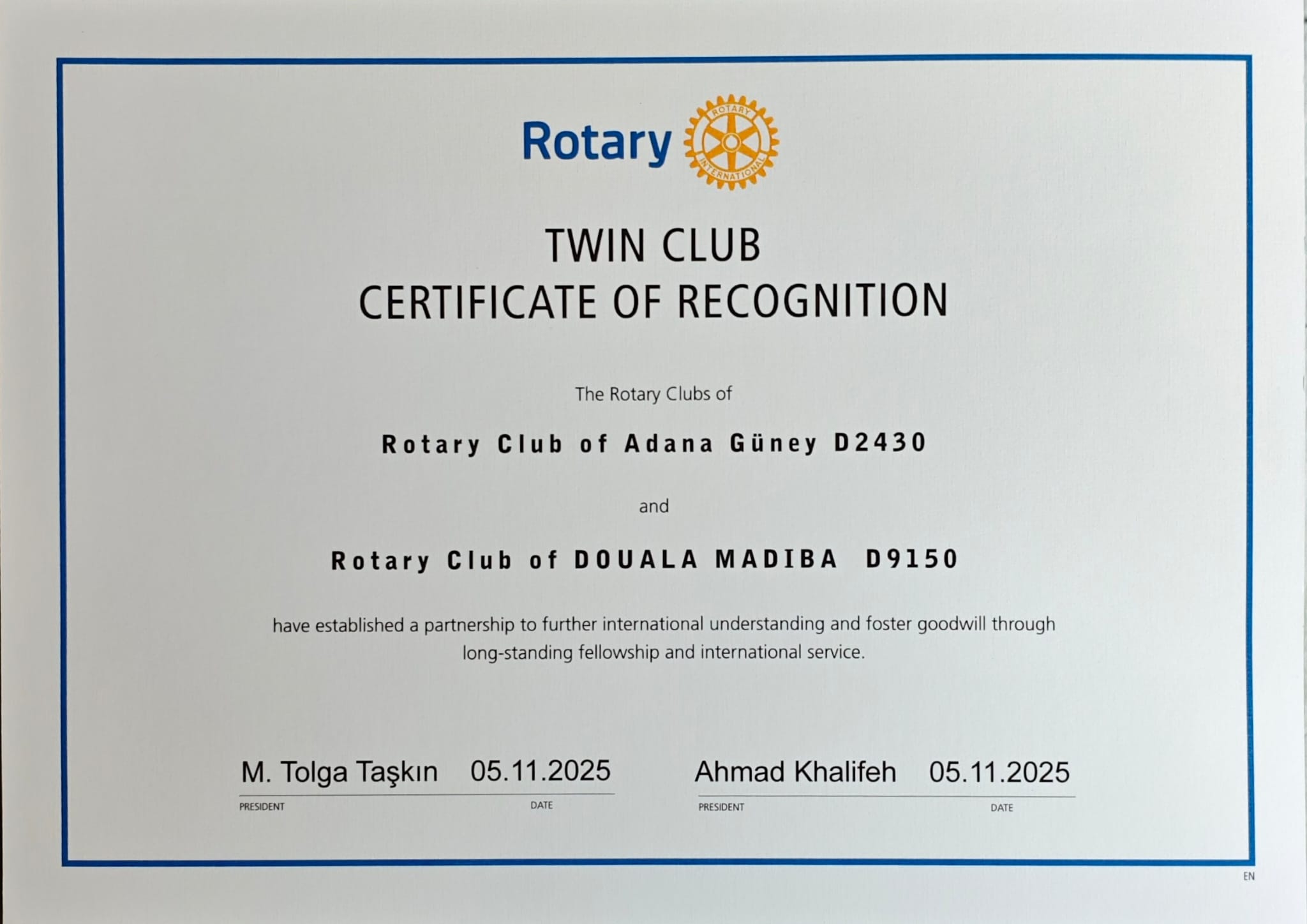 Adana Güney Rotary Kulübü olarak, 2025–26 döneminde protokol imzalayarak ikiz kulüp olduğumuz, Afrika Kamerun’da bulunan D9150 bölgesinde bulunan Douala Madiba Rotary Kulübü ile birlikte anlamlı bir projeye imza attık.