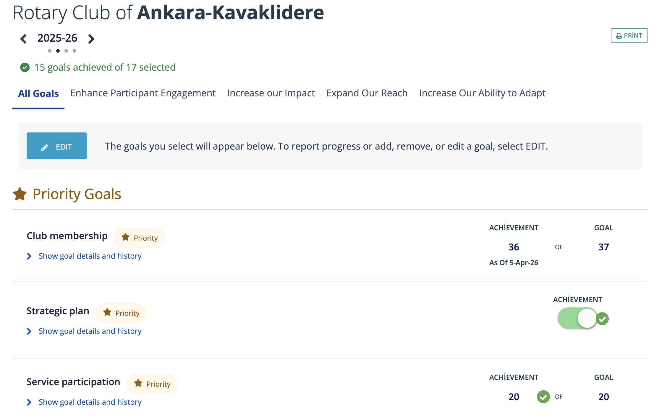 1 TEMMUZ 2025 TARİHİNDEN ÖNCE MY ROTARY KULÜP HEDEFLERİMİZ TAMAMLANMIŞTIR, BUGÜN İTİBARİ İLE İSE 17 HEDEFİN 15 İNE ERİŞMİŞ DURUMDAYIZ.