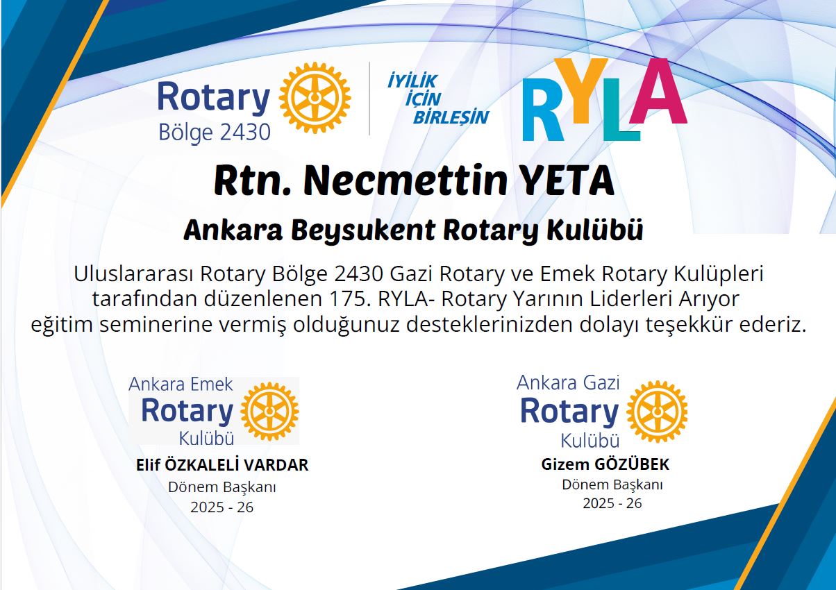 Amasya Yeşilırmak Rotary Kulübü tarafından 16-19 Ekim 2025 tarihlerinde Amasya'da düzenlenen 170. RYLA'ya bir, Ankara Gazi ve Emek Rotary Kulüpleri tarafından 12-15 Şubat tarihleri arasında Ankara'da düzenlenen 175. RYLA'ya bir olmak üzere toplamda iki (2) öğrencinin RYLA semineri katılımı için sponsor olduk. RYLA semineri düzenleyen ev sahibi kulüplere teşekkür ederiz. 175. RYLA'ya katılımı için destek olduğumuz öğrencimiz aynı zaman kulüp bursiyerimizdir.
