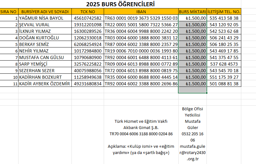 2025 EYLÜL AYINDAN İTİBAREN, 11 ÖĞRENCİMİZE BURS VERİYORUZ. BURS ÜCRETİMİZ ÖĞRENCİ BAŞINA 1500 TL DİR. ÖĞRENCİLERİMİZ ARASINDA DEPREMZEDE VE ENGELLİ MİLLİ SPORCUMUZ DA MEVCUTTUR.