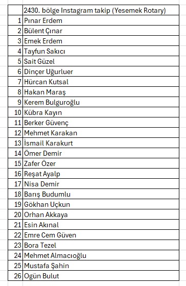 33 kişilik kulübümüzde en az 26 kişi bölge instagram hesabını takip etmektedir. Liste proje resimleri içindedir.