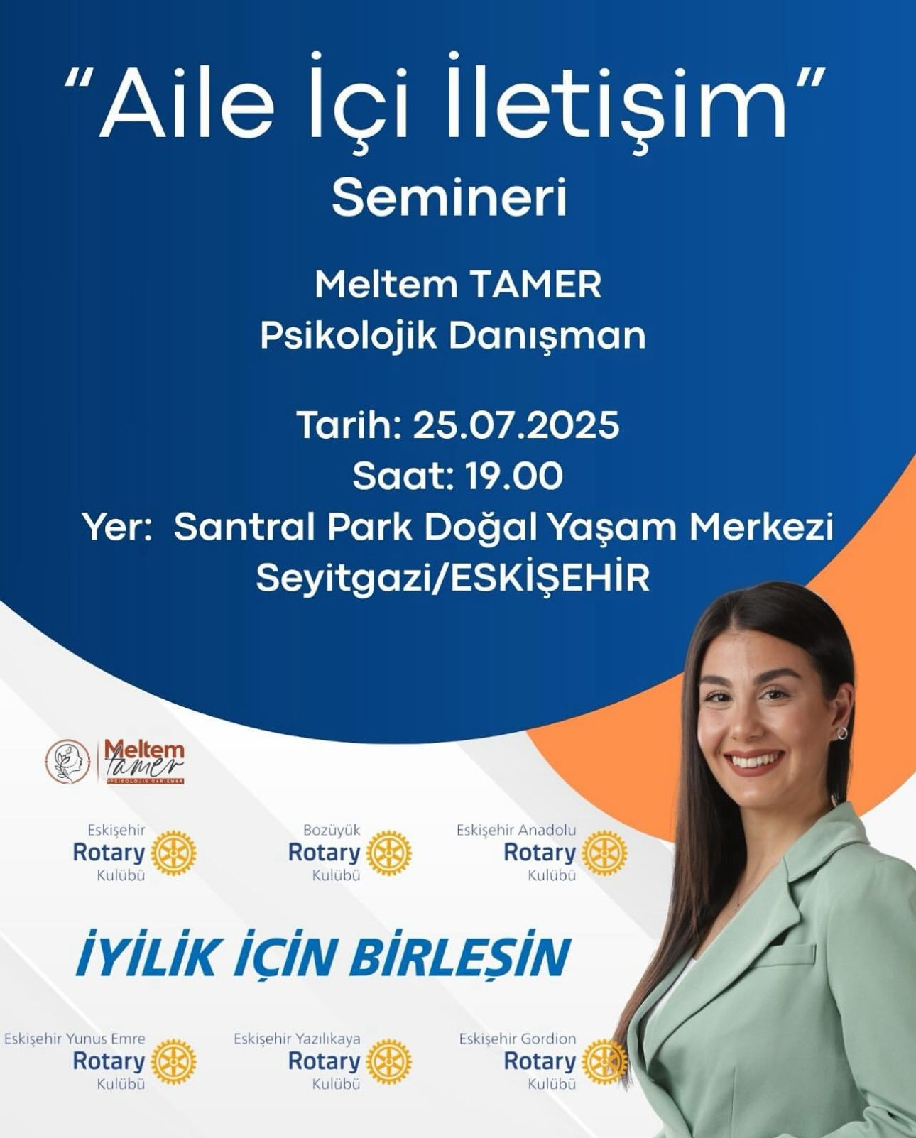Projemiz, Eskişehir Seyitgazi Belediyesine bağlı Santral Park Doğal Yaşam Merkezinde gerçekleştirilmiştir. Aile İçi İletişim hakkında bilgilendirme amacıyla düzenlenen etkinliğe; konuk konuşmacı olarak davet edilen alanında uzman Psikolojik Danışman Meltem Tamer ricamızı kırmayarak, harika bir seminer izlememize katkı sağlamıştır. Etkinliğimize rotaryen dostlarımız, sevgili misafirlerimiz ve çok değerli değişim programı ile gelen çocuklarımız katılmıştır. Eğitimde aile içi iletişimde doğru bilinen yanlışlara, davranış örüntülerinin önemine değinilerek aslında normal karıladığımız davranışların arakasındaki saklı duygudurumların önemi vurgulanmıştır.