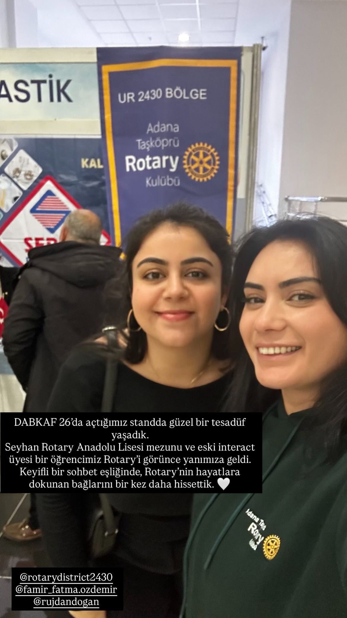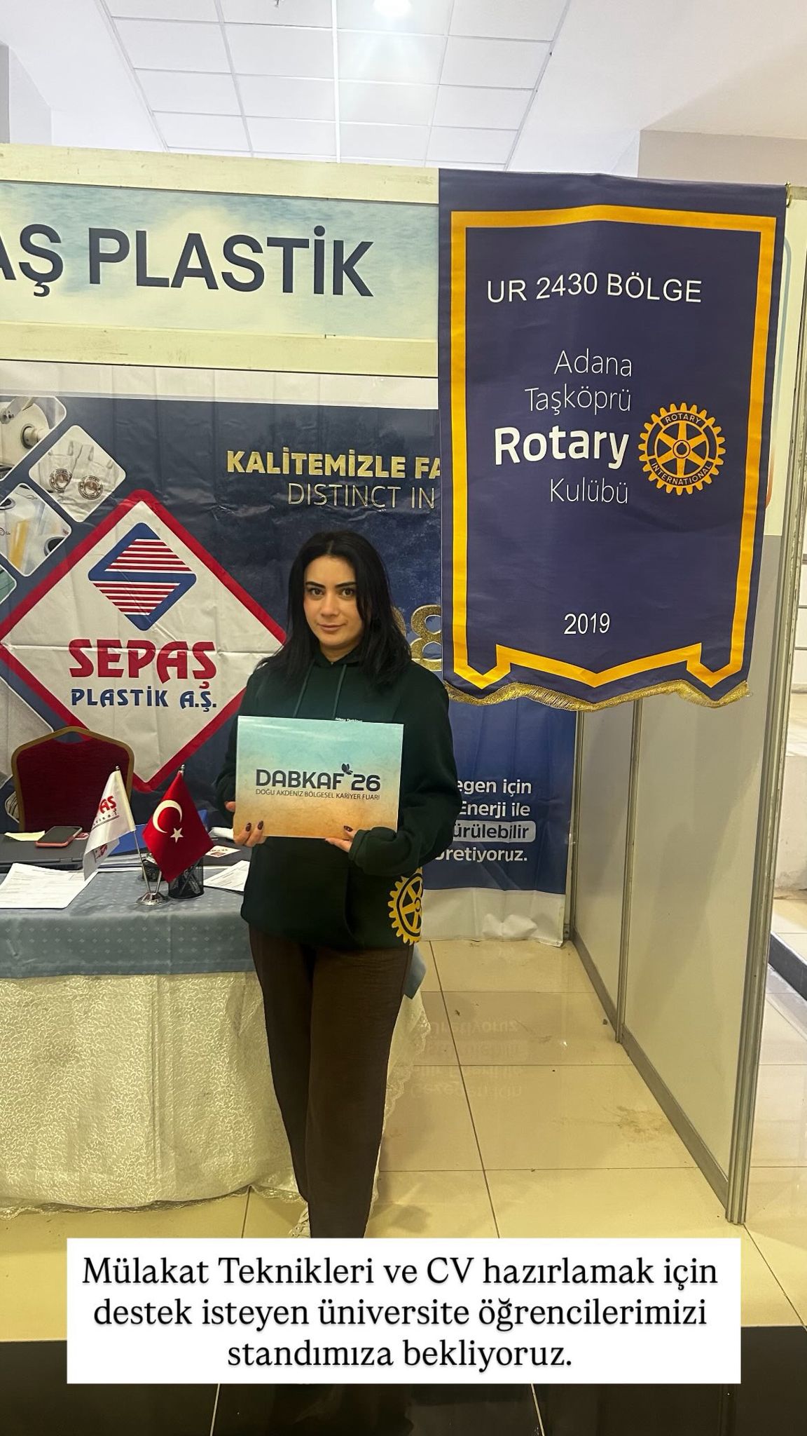 DABKAF 2026 Doğu Akdeniz Kariyer Fuarı kapsamında, Adana Taşköprü Rotary Kulübü olarak Sepaş Plastik A.Ş. iş birliğiyle; İnsan Kaynakları yetkilisi Gizem Acımış ve Famir Mühendislik ve İklimlendirme yöneticisi Fatma Özdemir’in katılımıyla etkinlikte aktif rol aldık.