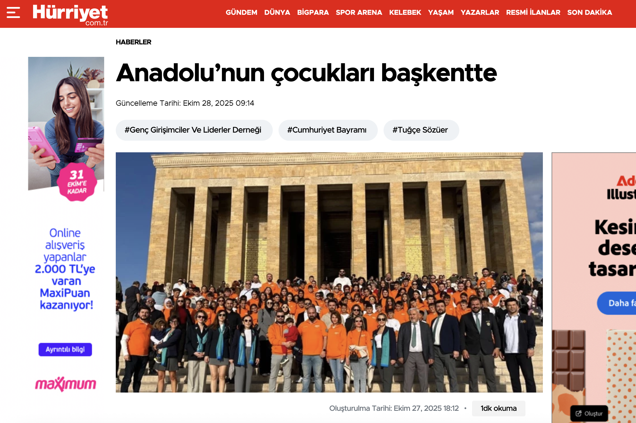 KAHRAMANMARAŞ TÜRKOĞLU ORTAOKULUNDAN GELEN 85 ÖĞRENCİ VE 8 ÖĞRETMEN İLE 1.T.B.M.M VE ANITKABİR ZİYARETİ GERÇEKLEŞTİRDİK. BU ZİYARETE AİT HABER 28 EKİM 2025 TARİHLİ HÜRRİYET GAZETESİNDE ÇIKTI.