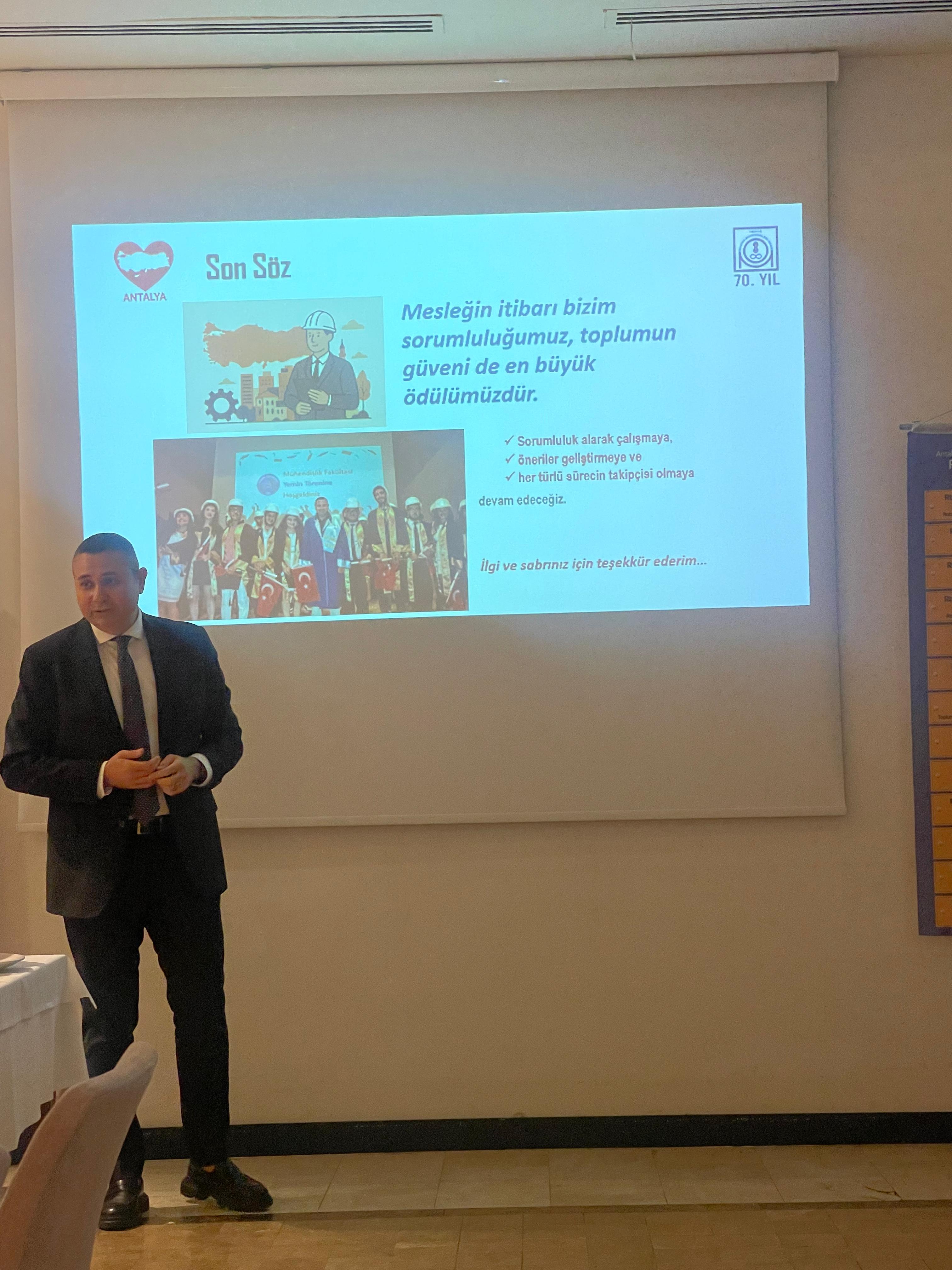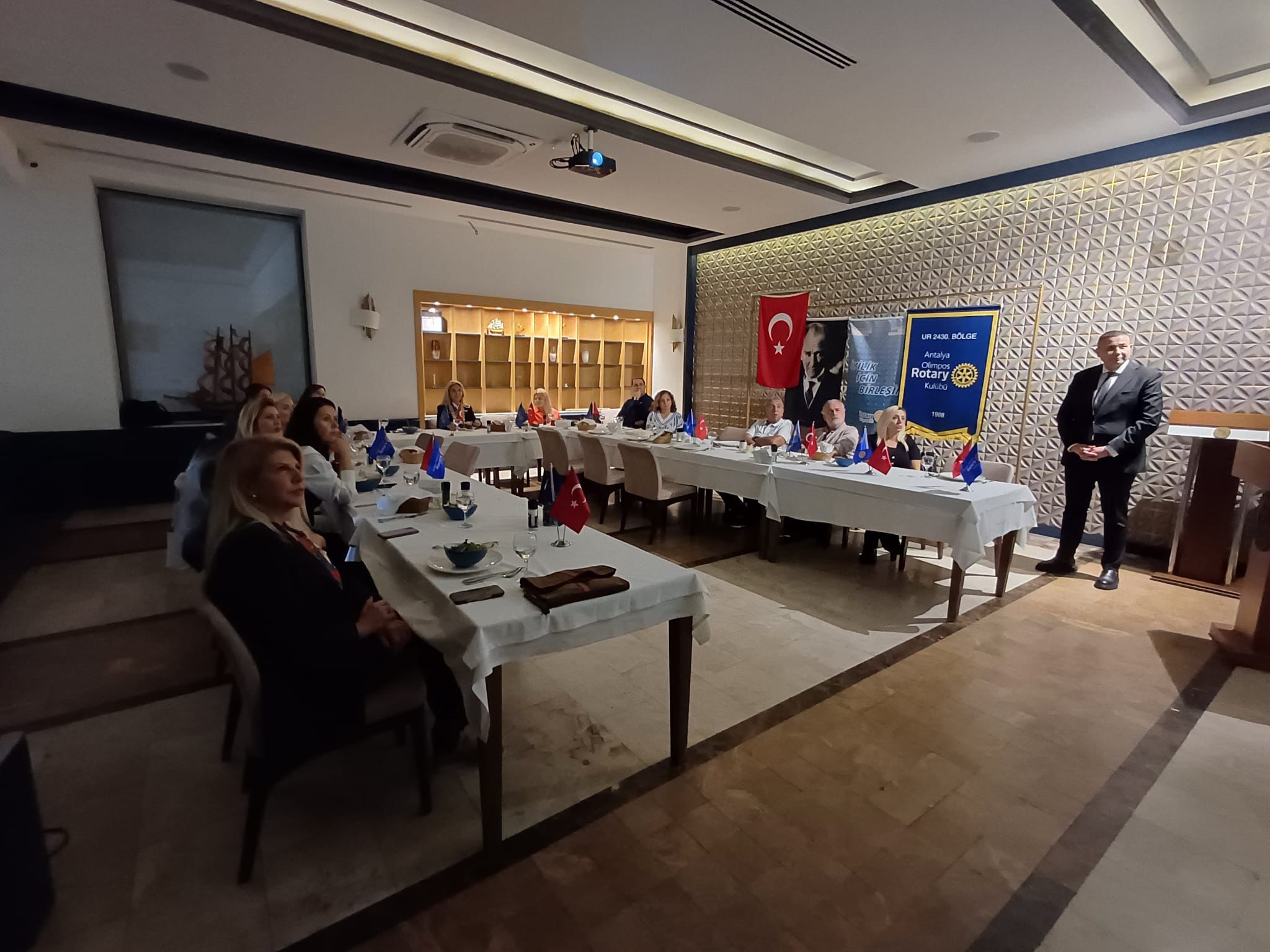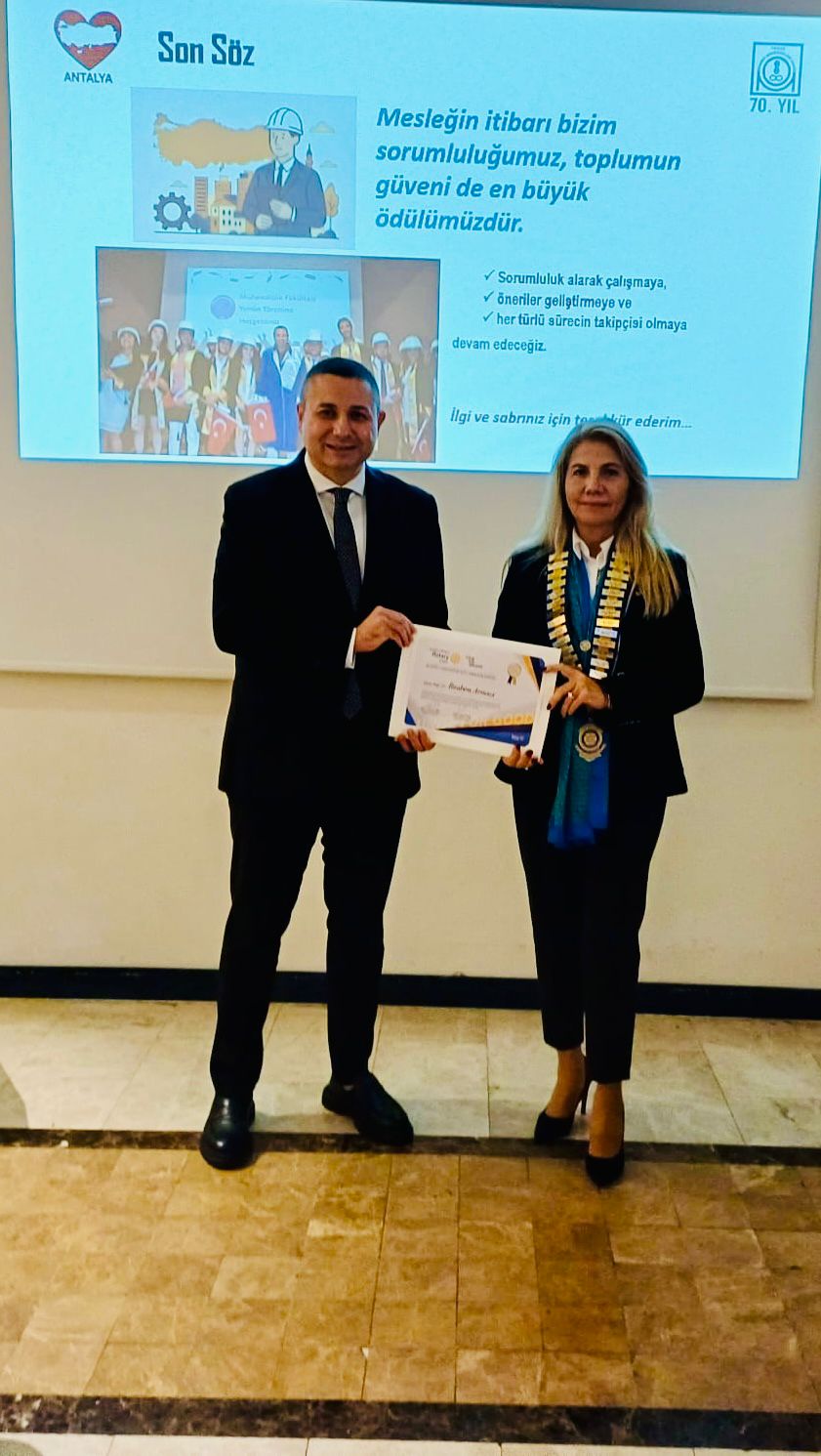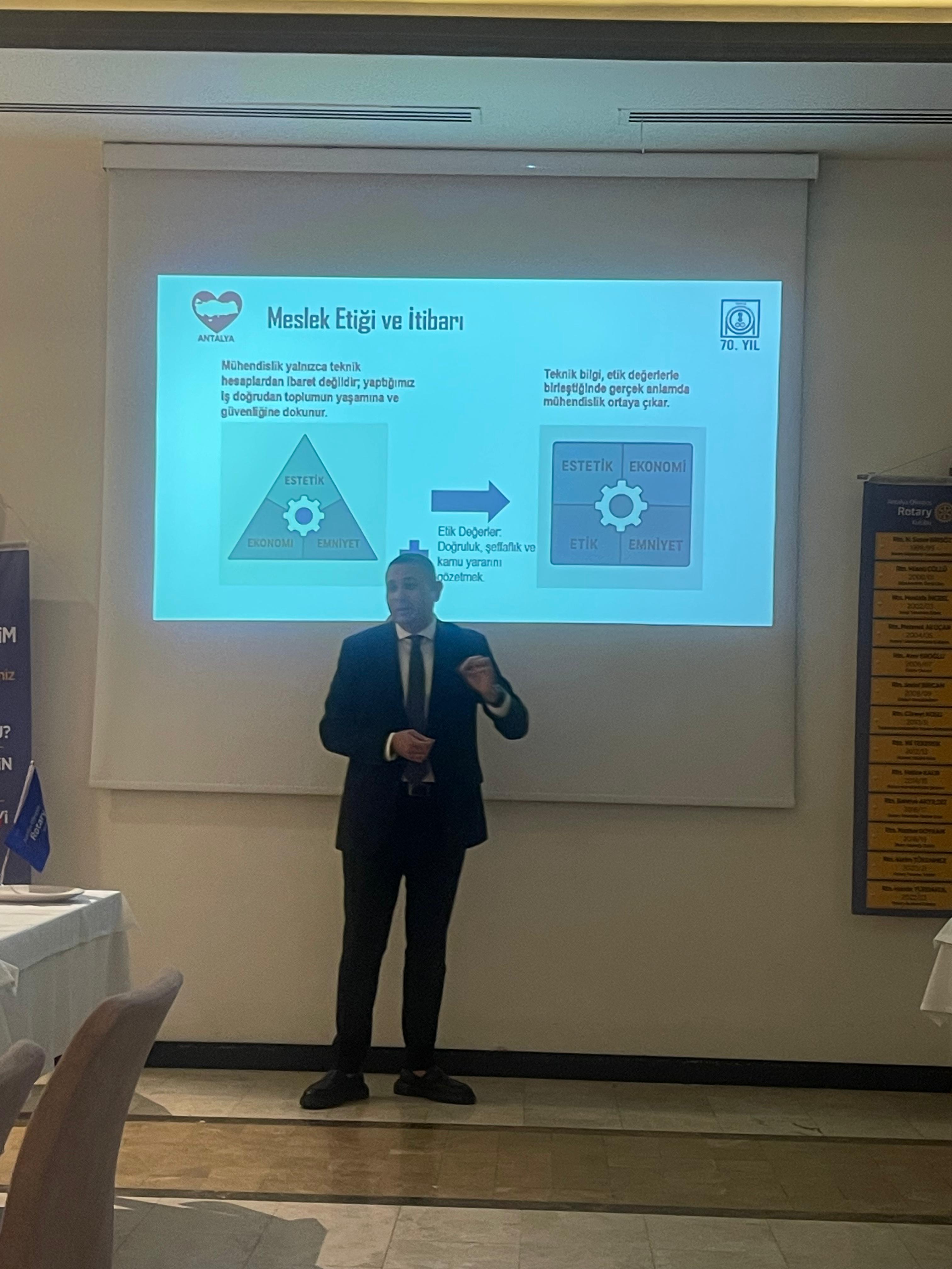 Antalya Olimpos Rotary Kulübü olarak, 23 Ekim 2025 Perşembe günü “Meslek Etiği ve İtibarı” Komitesi kapsamında, Antalya Makine Mühendisleri Odası Başkanı Prof. Dr. İbrahim Atmaca tarafından “Mühendis Gözüyle Kente ve Ülkeye Teknik Bakış, Meslek İtibarı ve Liyakat” konulu bir sunum gerçekleştirildi.