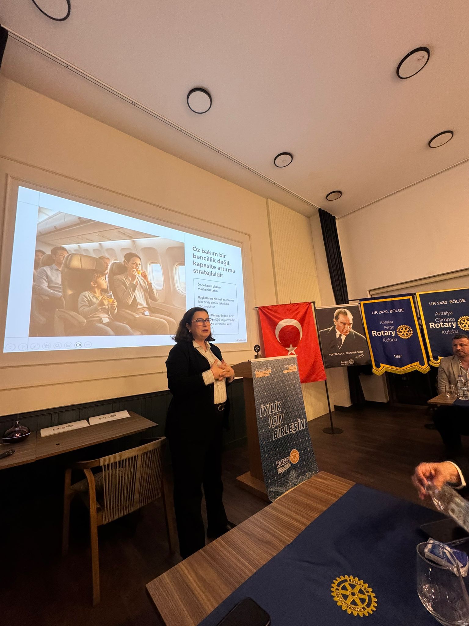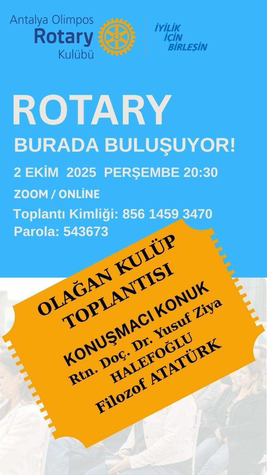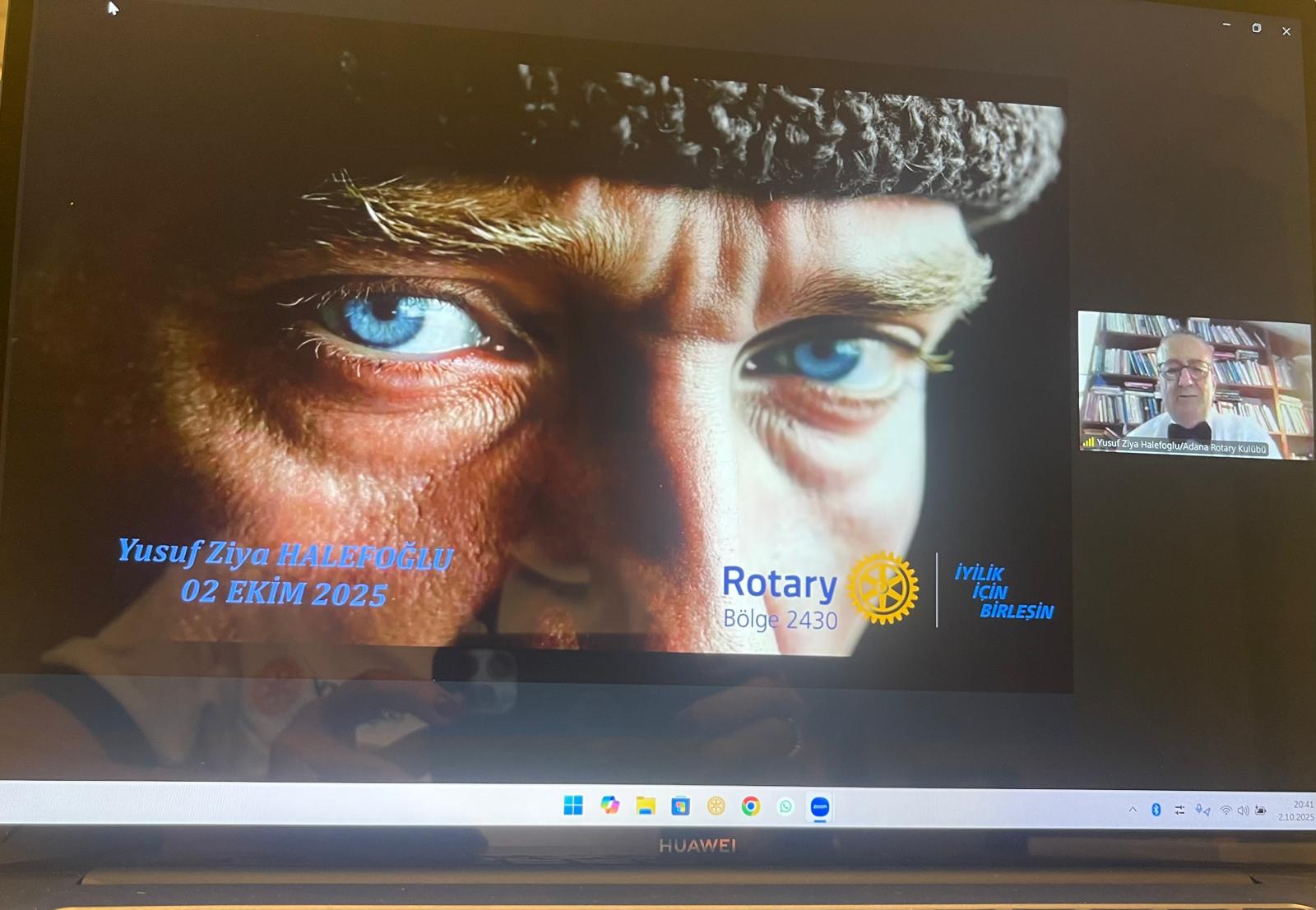 Antalya Olimpos Rotary Kulübü olarak, 2 Ekim 2025 Perşembe günü saat 20.30’da Zoom üzerinden gerçekleştirdiğimiz toplantımızda, Bölge Konuşmacı kaynağından Doç. Dr. Yusuf Ziya Halefoğlu’nun “Filozof Atatürk” başlıklı sunumunu büyük bir ilgiyle takip ettik.