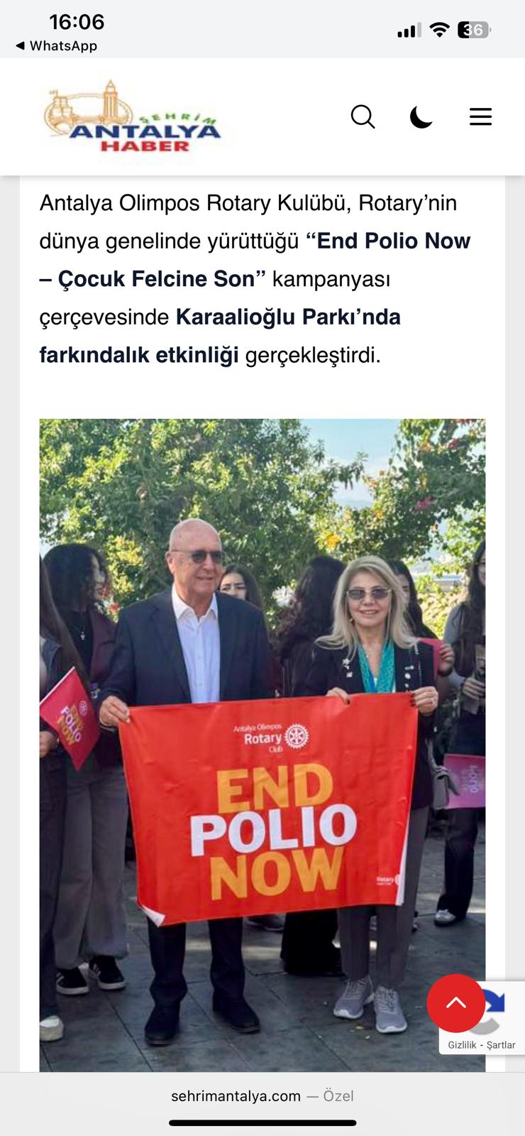 Antalya Olimpos Rotary Kulübü olarak, “Polio’suz bir dünya” hedefi doğrultusunda uluslararası sorumluluğumuzun bilinciyle çalışmalarımıza kararlılıkla devam edeceğiz.