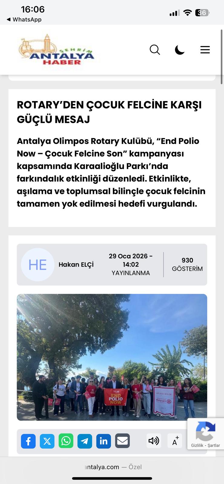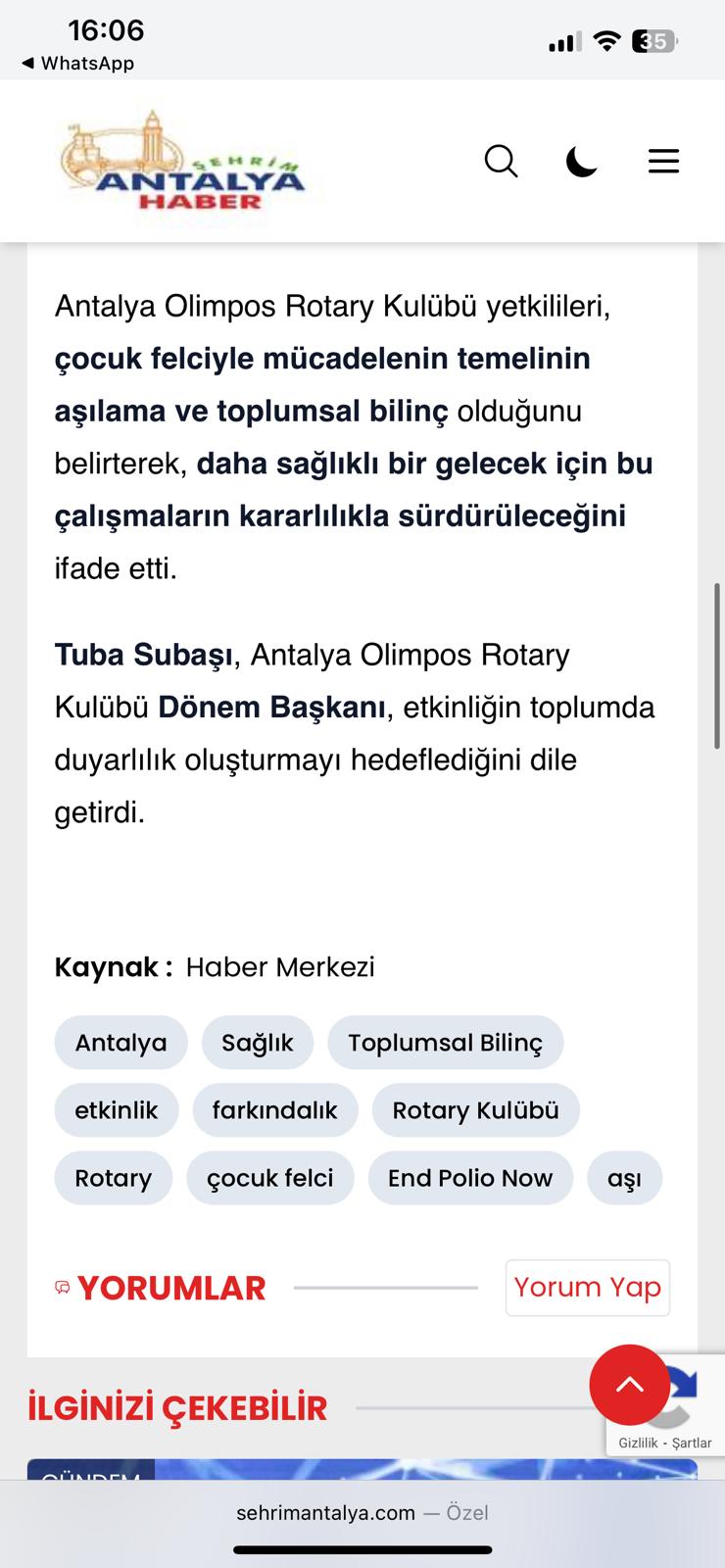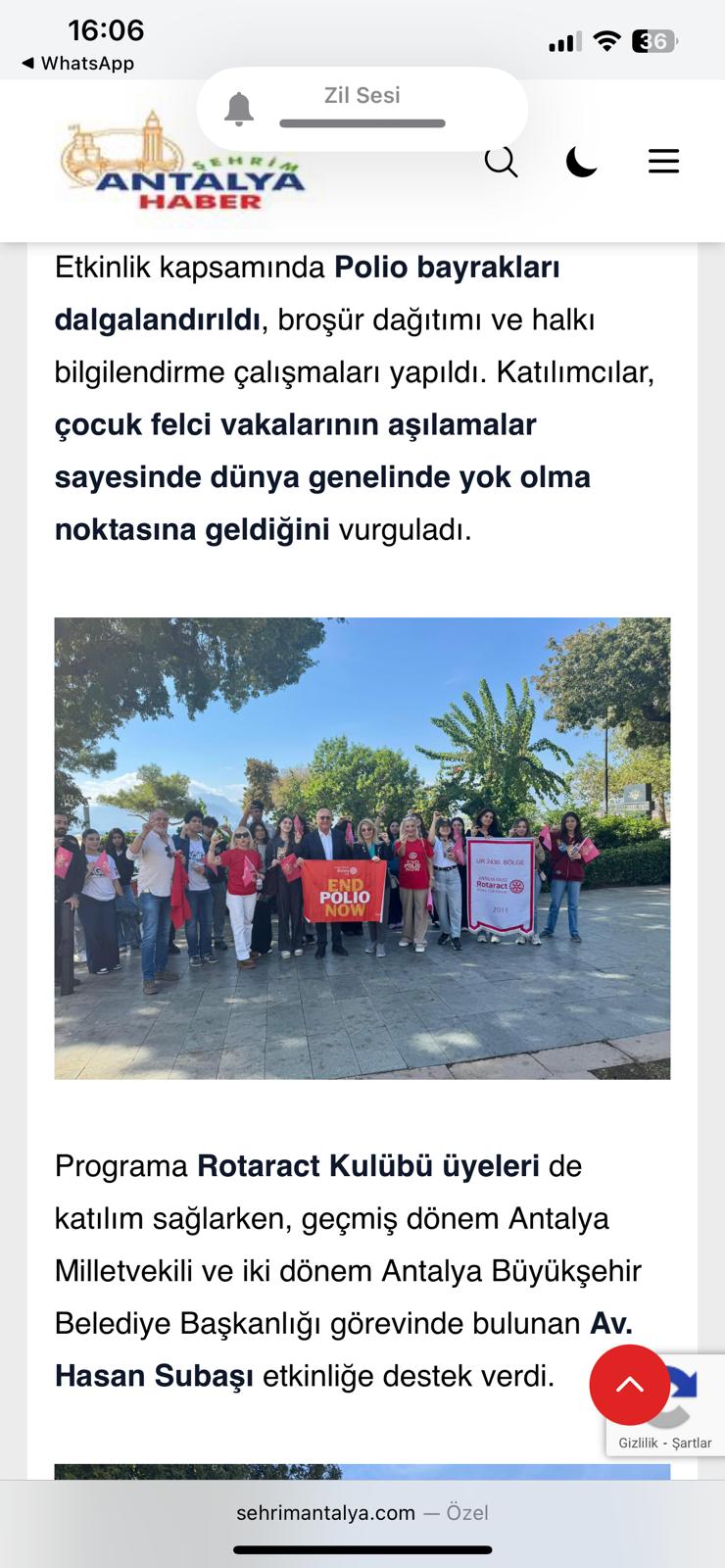Toplumun bilinçlendirilmesini hedefleyen etkinliğimizde, çocuk felcinin dünya genelinde tamamen ortadan kaldırılması yönündeki kararlılığımız bir kez daha vurgulandı. Rotary’nin temel öncelik alanlarından biri olan Polio ile Mücadele kapsamında gerçekleştirilen bu çalışma, kamuoyunda ilgi görerek Antalya basınında da yer aldı.