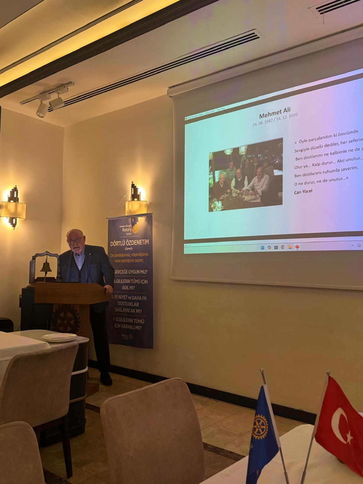 Antalya Olimpos Rotary Kulübü olarak 19 Şubat tarihli olağan toplantımızı, Vefa Komitesi kapsamında; kulübümüze emekleri ve liderliğiyle derin izler bırakmış merhum Başkanımız Mehmet Ali Uçar’ı anmaya adadık.