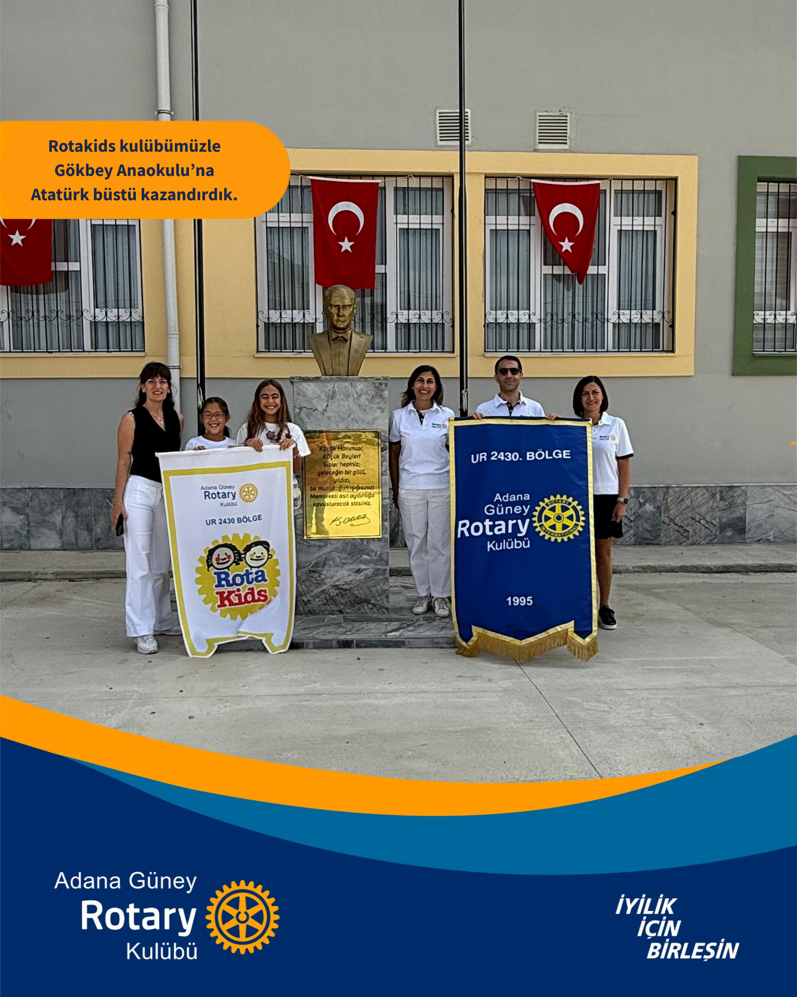 Adana İncirlik İlçesi Kemalpaşa mahallesinde bulunan Gökbey Anaokulu'na ve Hürkuş Anaokulu'na eksik olan Atatürk Köşesi- Atatürk Büstü ve okullarda eğitim görmekte olan çocuklar için Oyuncak ve kitap bağışında bulunduk.