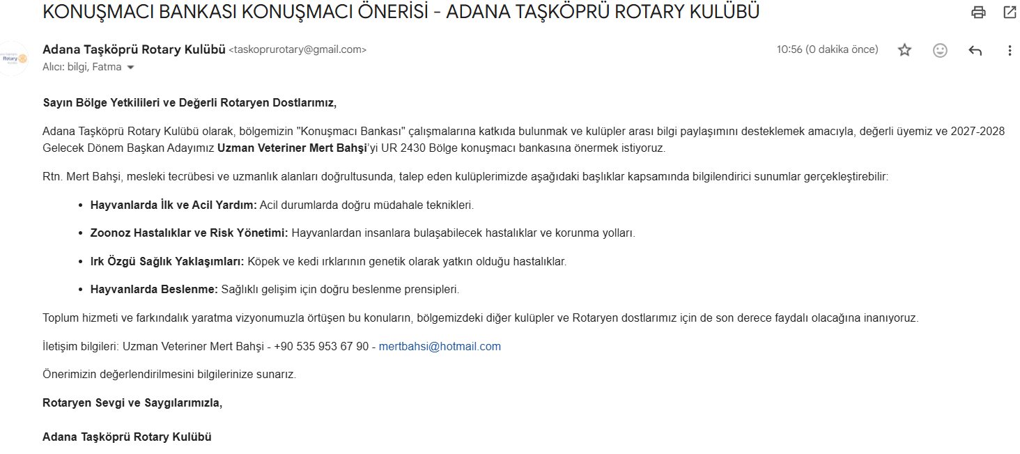 Adana Taşköprü Rotary Kulübü olarak, bölgemizin "Konuşmacı Bankası" çalışmalarına katkıda bulunmak ve kulüpler arası bilgi paylaşımını desteklemek amacıyla, değerli üyemiz ve 2027-2028 Gelecek Dönem Başkan Adayımız Uzman Veteriner Mert Bahşi’yi UR 2430 Bölge konuşmacı bankasına önermek istiyoruz.