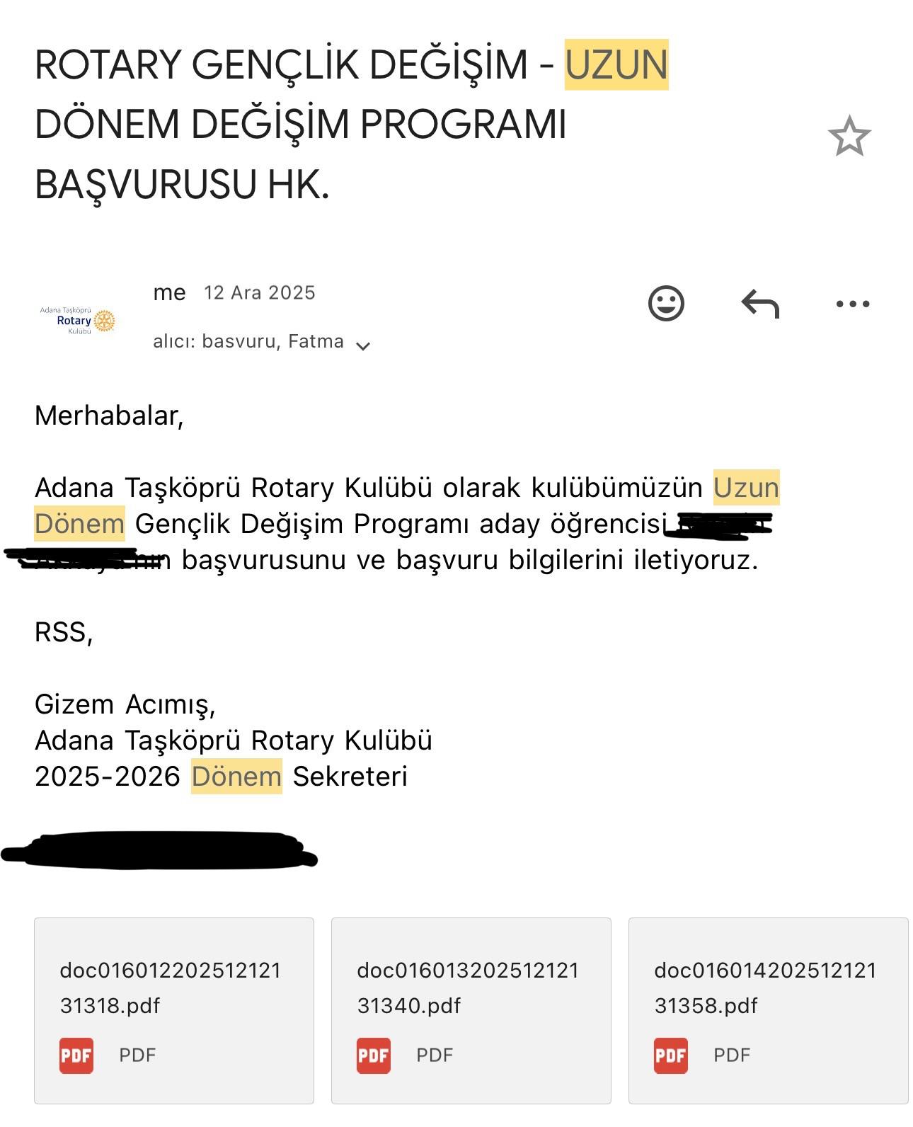 - Proje Adı: Adana Taşköprü Rotary Kulübü Uzun Dönem Gençlik Değişim Adayı