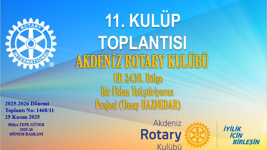Akdeniz Rotary Kulübü olarak UR 2430. Bölge'nin “Bir Fidan Yetiştiriyoruz” projesi kapsamında, Mersin Güzel Sanatlar Lisesi öğrencisi Umay Haznedar, tüm belgeleri tamamlanarak kulübümüzün fidanı olarak yapmış olduğumuz başvuru 22 Kasım’da kabul oldu ve 25 Kasımda , kulübümüzün 1468. Dönemimizin 11. toplantısında üyelerimizle tanıştırıldı. Fidanımıza yapılacak harcamalar eşler komitemizin organize edeceği ve her yıl düzenleyeceğimiz Tenis Turnuvası ile karşılayacağız .