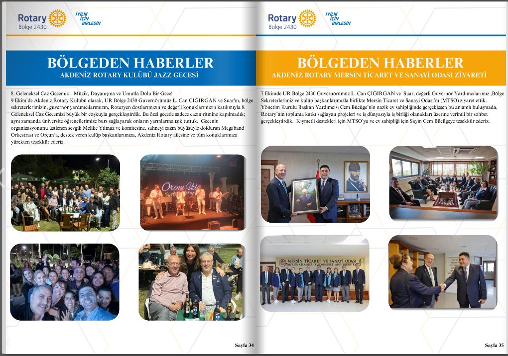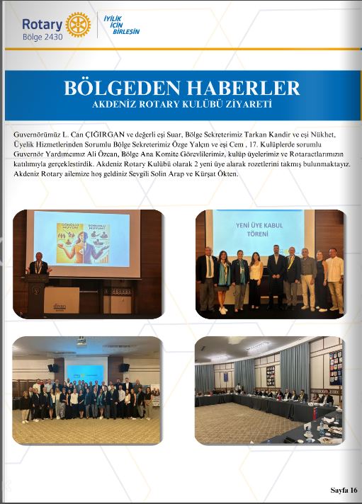 Akdeniz Rotary Kulübü olarak 7 Ekim’de gerçekleştirilen Guvernör Ziyareti ile ilgili hazırlanan içerik ve bilgiler, ziyaretin ardından en geç bir hafta içinde Bölge Bültenine gönderilmiştir. Kulübümüzde gerçekleşen bu anlamlı ziyaret, Guvernörümüzün Aylık Mektubu ve Bölge Bülteninde de yer alarak Rotary ailesi ile paylaşılmıştır.