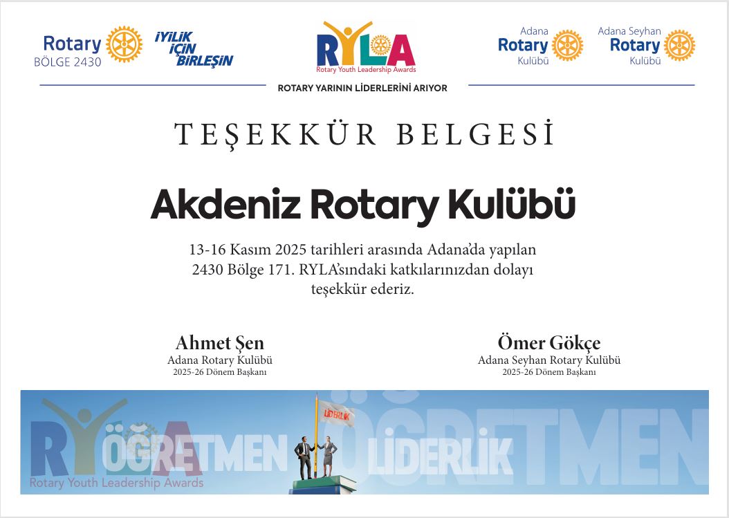 Akdeniz Rotary Kulübü olarak, Adana Rotary ve Seyhan Rotary Kulüplerinin 13-16 Kasım tarihlerinde düzenlediği 2430. Bölge 171. RYLA (Rotary Youth Leadership Awards) programına iki gencimize sponsor olarak katılım sağladık.