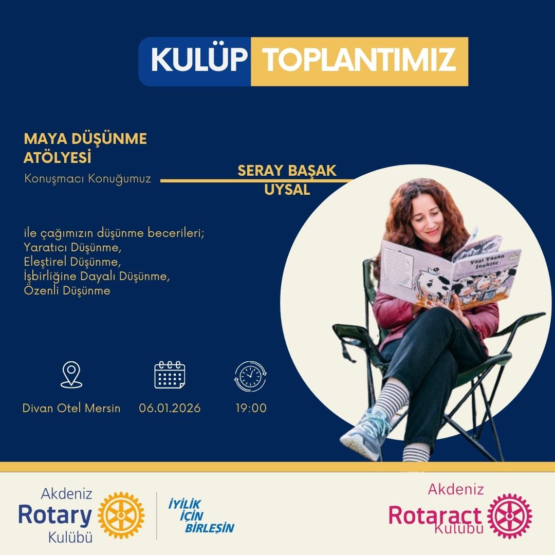 2- Dönemimizin 21. toplantısını Divan Otelde 9 Nisanda tüm Mersindeki Rotary ve Rotaract Kulüpleri ile ortak toplantı yapıyoruz . Konuşmacı konuğumuz Deneyim Psikolojisi ve İnsan Analizi alanında uzman Ethem Kocabaş olacaktır. Toplantıda insan davranışlarını, karar mekanizmalarını ve deneyimlerin psikolojik etkilerini birlikte keşfedecek, kulüpler arası dostluğu daha da güçlendireceğiz.