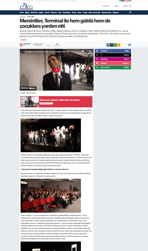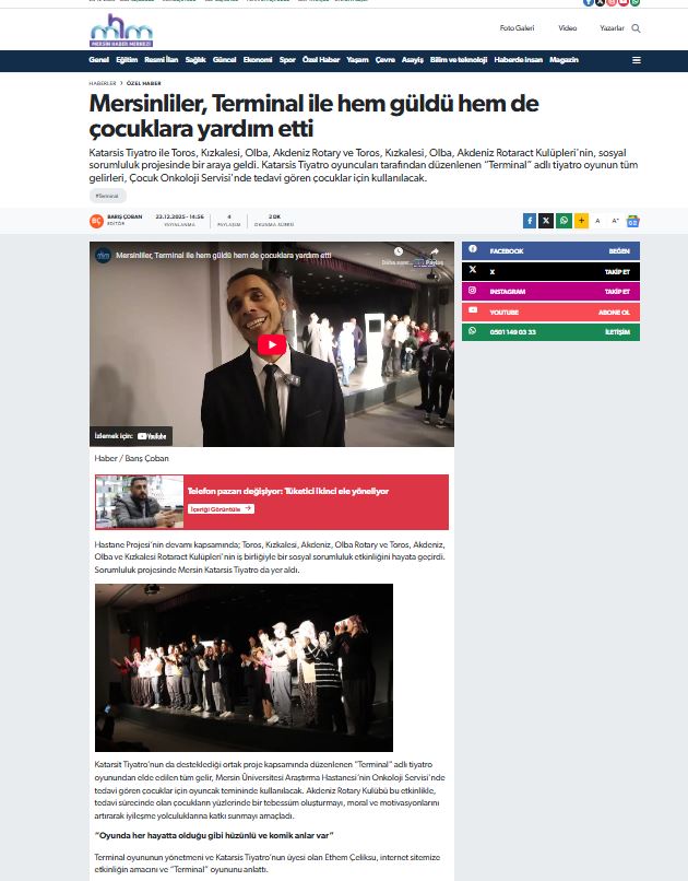 2- Akdeniz Rotary Kulübü olarak Katarsist Tiyatro Ekibinin iş birliğiyle 22 Aralık da düzenlenen “Terminal” adlı oyun etkinliğimiz 23 Aralıkta Mersin Haber Merkezi Gazetesinde yayınlandı.