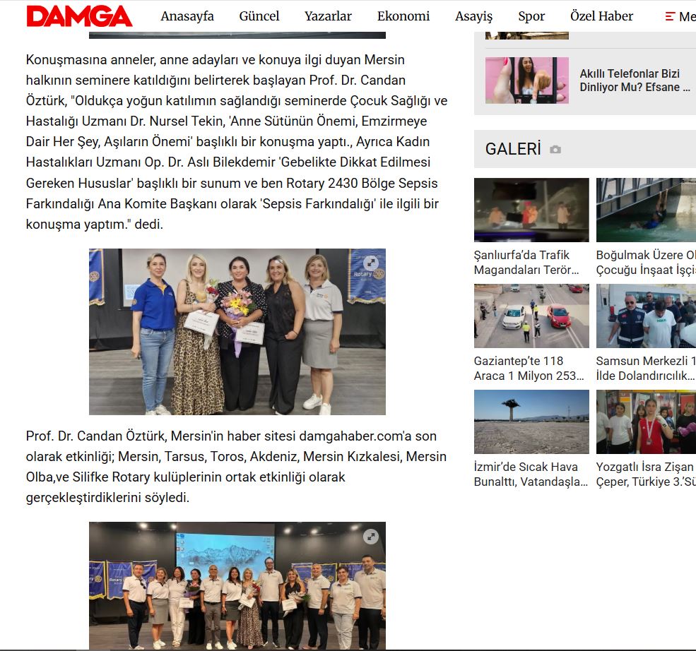1- Akdeniz Rotary Kulübü olarak, 23 temmuzda yapılan Anne Çocuk Sağlığı ve Sepsis Farkındalık Seminerimiz 24 Temmuzda Damga gazetesinde haberimiz yayınlanmıştır.