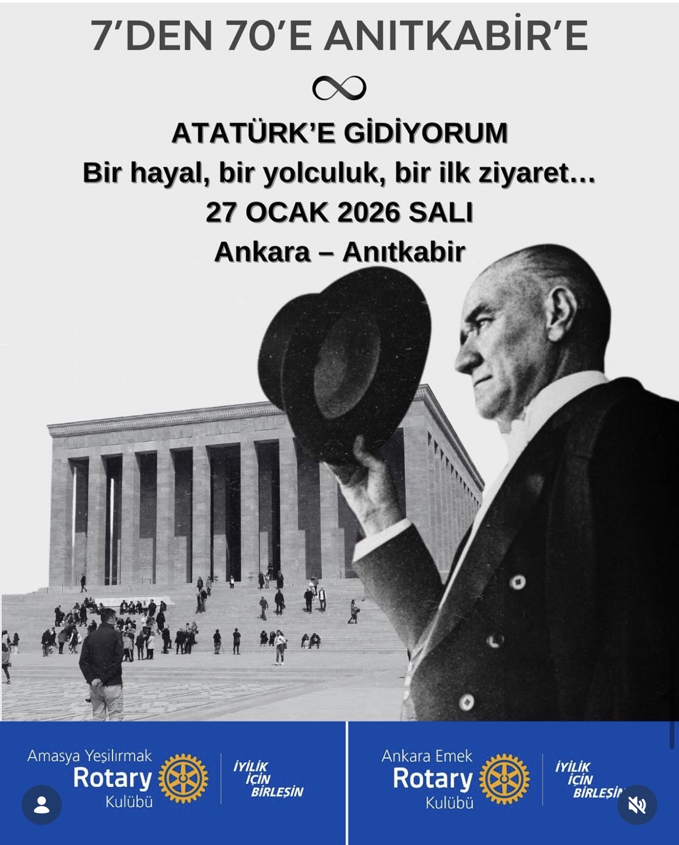Amasya Yeşilırmak Rotary Kulübü ve Ankara Emek Rotary Kulübü ile ortaklaşa Atatürk'e gidiyorum Projesi kapsamında Amasya'nın Uygur Köyü'den 37 Çocuk ve 8 yetişkin genç,kadın ve erkeklerin katılımı ile 45 kişi ile Anıtkabir'e ziyaret gerçekleştirildi.Gezi Kapsamında Türkiye Büyük Millet Meclisi,1 nci Türkiye Millet Meclisi,ve Ankara Medeniyetler Müzesi ziyarteleri gerçekleştirildi.Anıtkabir Programı 14.30 Kurtuluş Savaşı Müzesi ziyartei ile başladı.15.30 da tüm katılımcılar ve 2025-2026 Dönem Güvernörü Rtn.Can Çığırgan ,Ana Komite Başkanı Rtn.Ayça İpek ,Amasya Yeşilırmak ve AnkaraEmek Rotary Kulübü üyelerinin katılı ile mozoleye çelenk sunma töreni gerçekleştirildi.Törenin ardından Amasya Yeşilırmak Rotary Kulübü Dönem Başk.Rtn.Atilla Özgen Anıtkabir Anı defterine günün anlam ve önemine ilişkin mesajını yazdı.Mesajda; "Aziz Atatürk, Emanet ettiğiniz Cumhuriyet'in değerlerine bağlılıkla,izninizde yürümeye devam edeceğimize söz vermek için huzurunuzdayız.Amasys Yeşilırmak Rotary Kulübü olarak çocuklarımızı,gençlerimizi ve toplumumuzu Cumhuriyet bilinciyle buluşturmanın onurunu yaşıyoruz.Ruhunuz şad olsun."