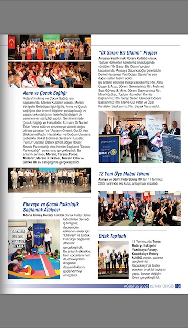 Amasya Yeşilırmak Rotary Kulübü'nün 23 Temmuz 2025 tarihinde Amasya Sabuncuoğlu Şerefeddin Eğitim ve Araştırma Hastanesi Yenidoğan kliniğinde gerçekleştirdiği "İlk Saran Biz Olalım" projemiz Rotary Dergisi Ağustos 2025 sayısında yayınlanmıştır.
