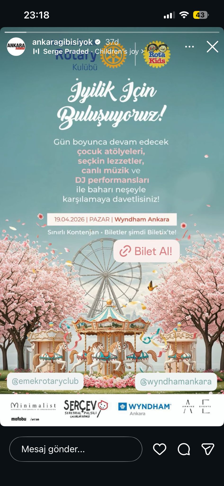 Ankara Emek rotary ve Ankara Emek Rotakids kulüpleri ortak projesinde 19 Nisan da Wyndam otelde 1.Geleneksel Bahar Şenliğini düzenliyoruz.Çok sayıda çocuk atölyesi,canlı müzik etkinlikleri,partili dostlarımız ve şahane markaların gastronomi lezzetleri ike çocuklar ve ebeveynler olarak harika bir gün geçireceğiz.Elde edeceğimiz geliri SERÇEV işbirliği ile deprem bölgesinde-özellikle kırsal kesimde-tekerlekli sandalye ihtiyacı olan çocuklar için kullanacağız .