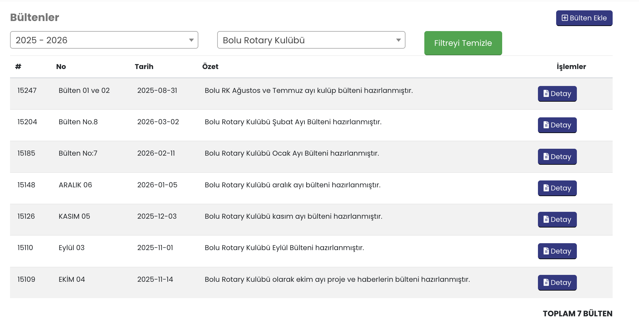 Bolu RK Kulüp Bülteni düzenli olarak hazırlanmış ve Bölge web sayfasına düzenli olarak eklenmiştir.