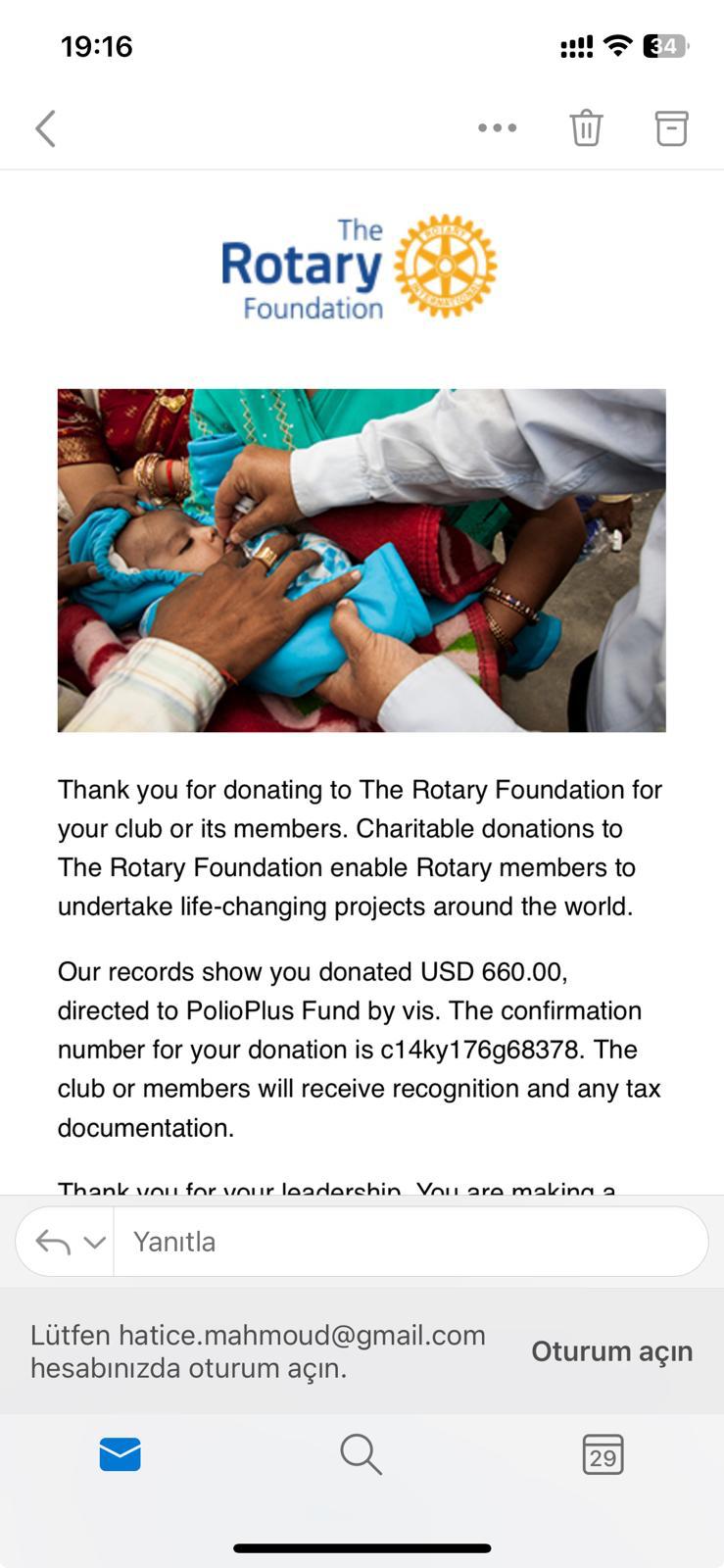 Our records show you donated USD 660.00, directed to PolioPlus Fund by vis. The confirmation number for your donation is c14ky176g68378. The club or members will receive recognition and any tax documentation.