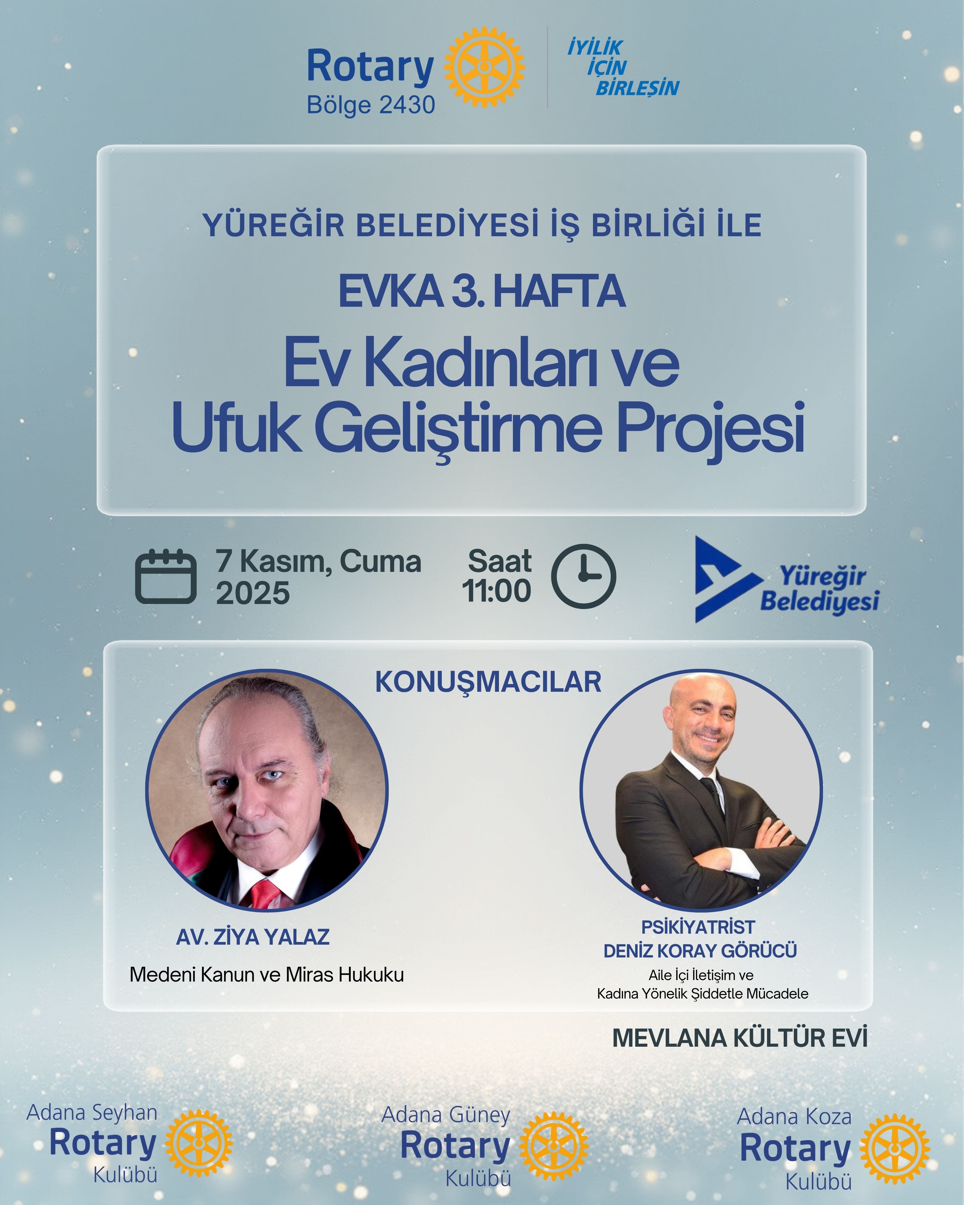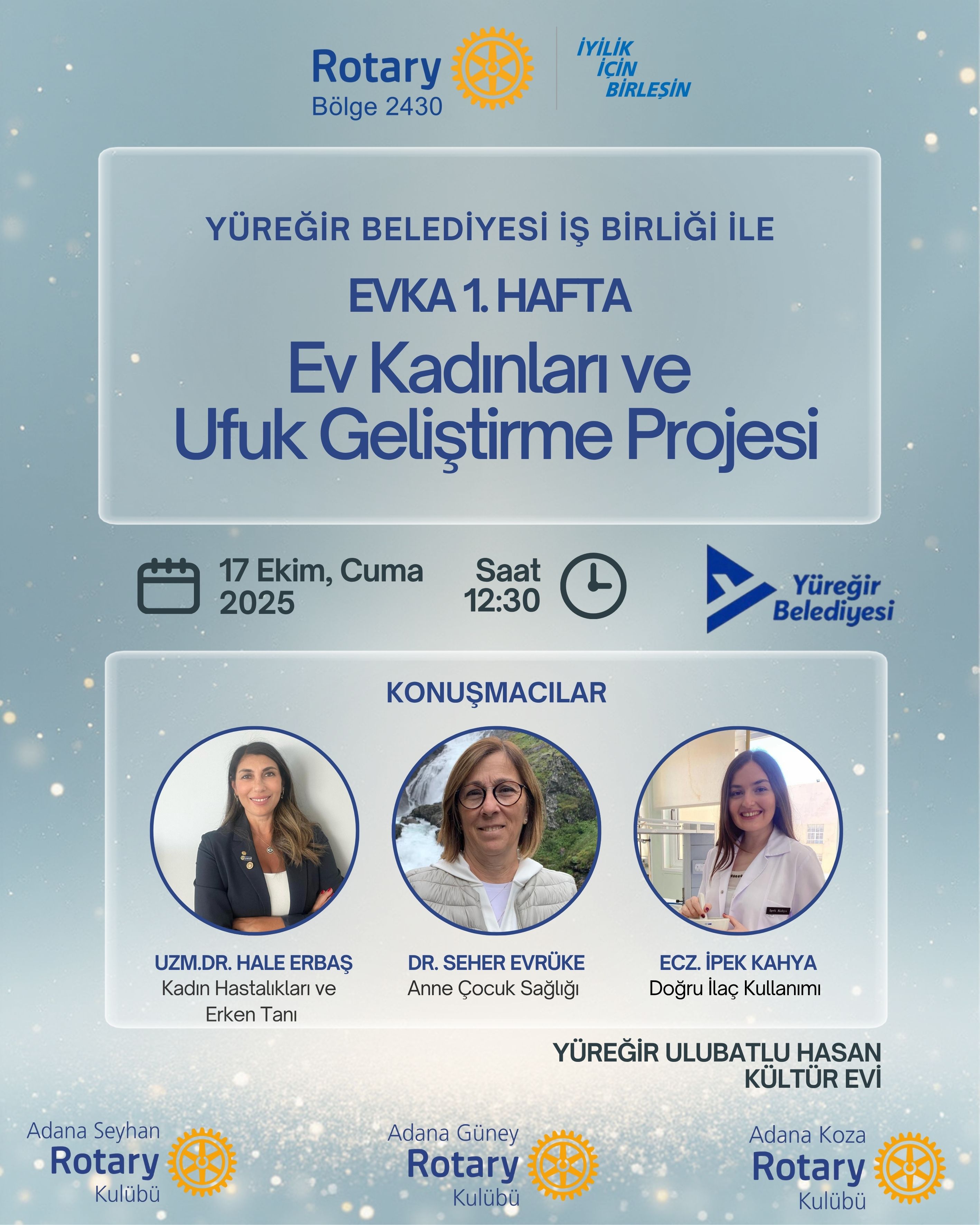Yüreğir Belediyesi iş birliği ile 3 etap olarak gerçekleştirdiğimiz EVKA projemizde Sağlık, Kadın hakları, aile içi iletişim,beslenme,otizm ve çevre konularında farkındalık yarattık. 3 etapta gerçekleştirdiğimiz eğitimlerimizde toplam 150 kadına ulaştık. Etkinlikleri Adana Güney RK, Adana Seyhan RK ve Adana Koza RK işbirliği ile gerçekleştirdik.