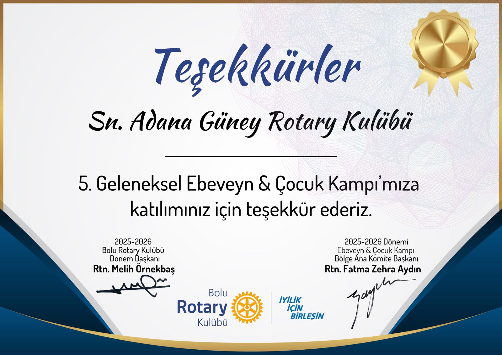 Adana Güney Rotary Kulübü olarak, Bolu Rotary Kulübünün 11-12 tarihlerinde düzenlemiş olduğu Ebeveyn-Çocuk kampına 2 kişilik katılım sağladık.