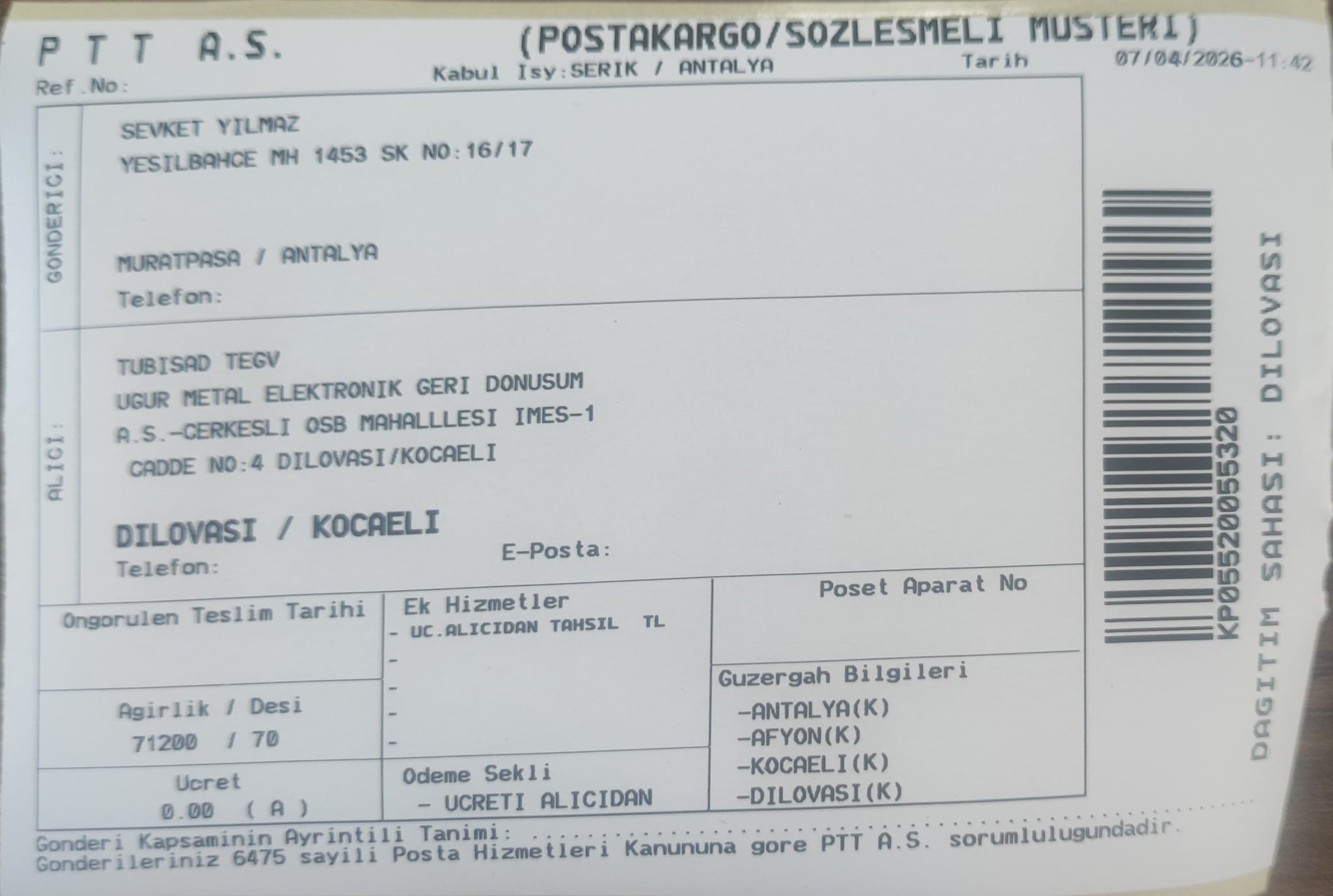 Kulüp üyelerimiz ve kulüp toplantı gerçekleştirdiğimiz işletmeler tarafından toplanan toplam 71.200 kg elektronik atık TEGV'e bağış olarak ulaştırılmıştır. Atıkların kargo fişi ektedir.