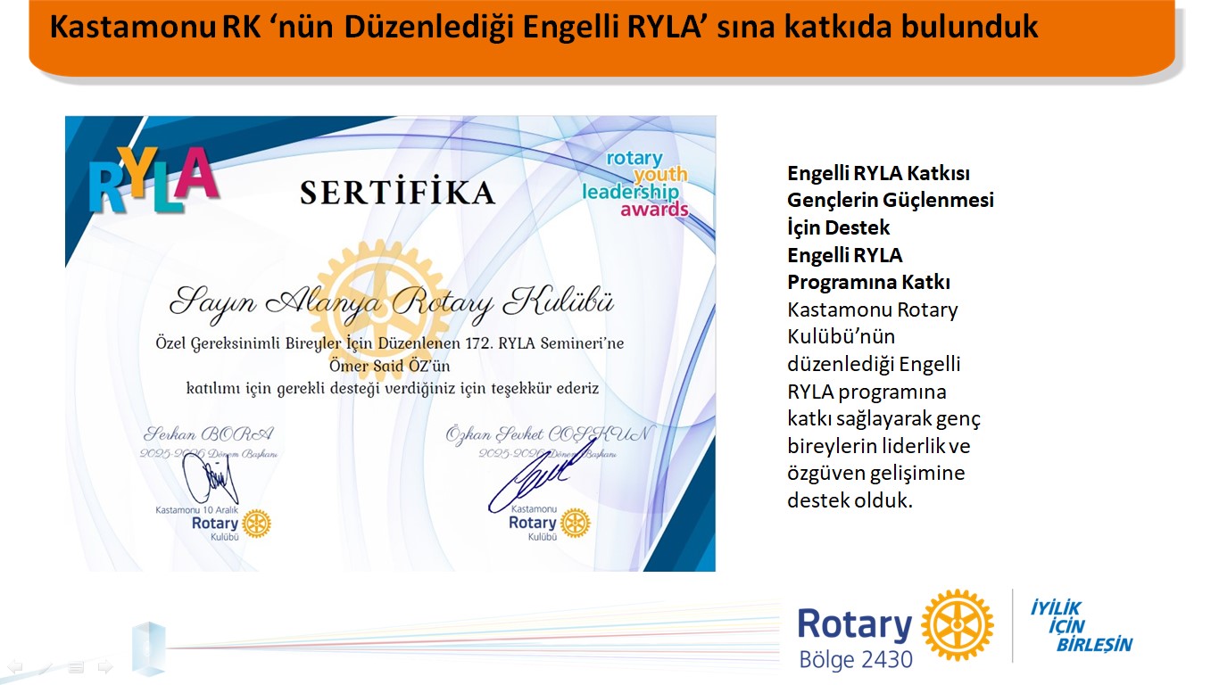 Engelli RYLA Katkısı Gençlerin Güçlenmesi İçin Destek Engelli RYLA Programına Katkı. Kastamonu Rotary Kulübü’nün düzenlediği Engelli RYLA programına katkı sağlayarak genç bireylerin liderlik ve özgüven gelişimine destek olduk.